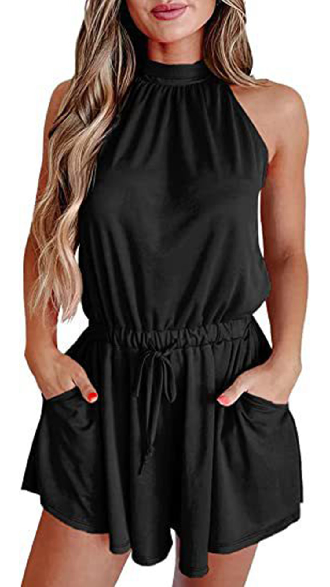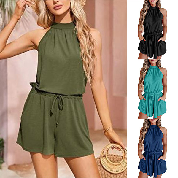 This is a casual romper for casual wear. It features a simple and timeless design with a mock neck and sleeveless silhouette. The drawstring waistline helps to create a flattering and feminine shape while also providing comfort and flexibility. The side pockets add a touch of functionality and practicality, making it easy to carry your essentials.