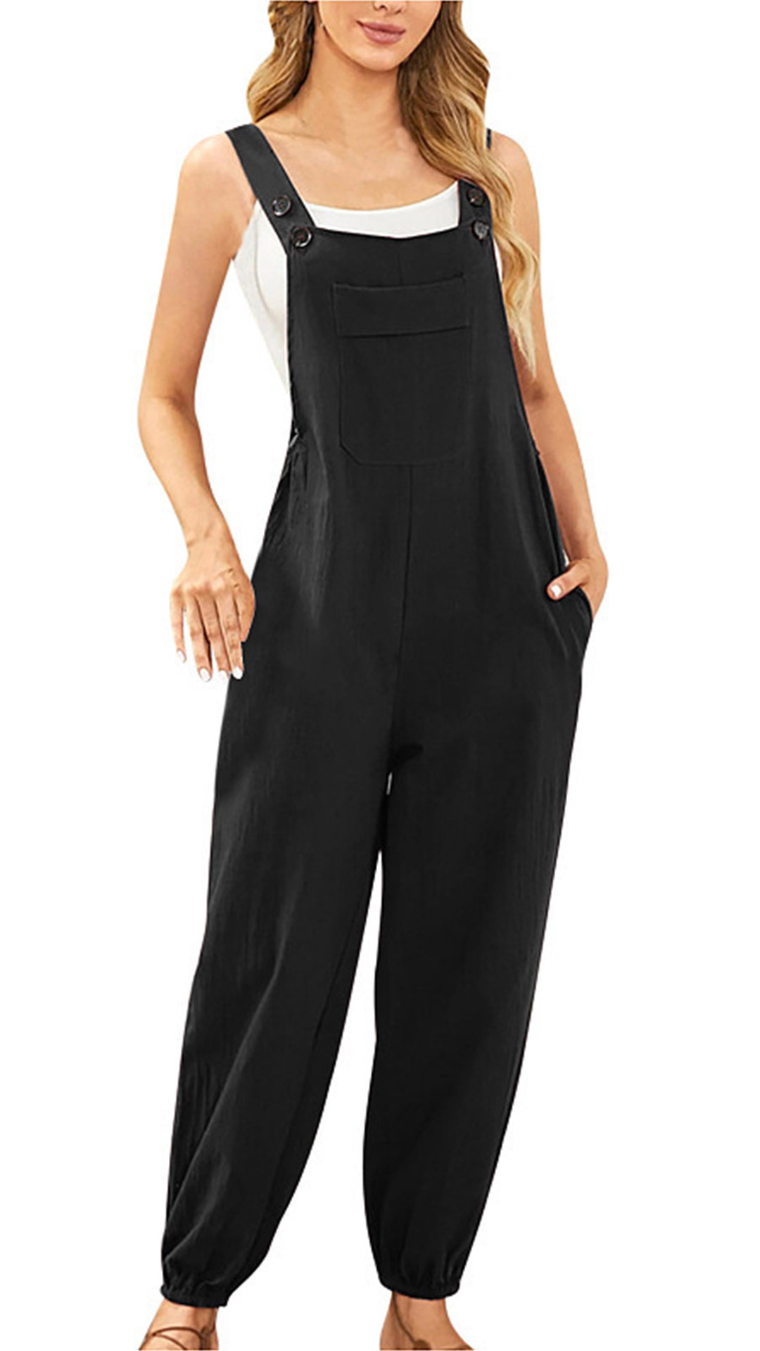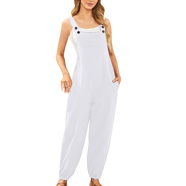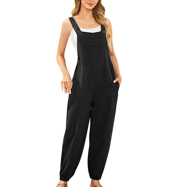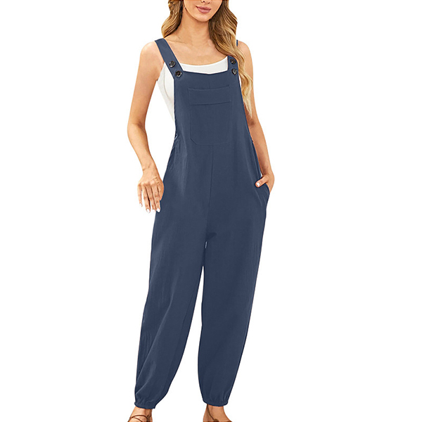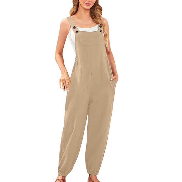 This versatile jumpsuit combines comfort, style, and a touch of casual elegance. The key features include a solid color, patch pockets, a cotton-linen blend fabric, and a suspender design. Wanna have a try?