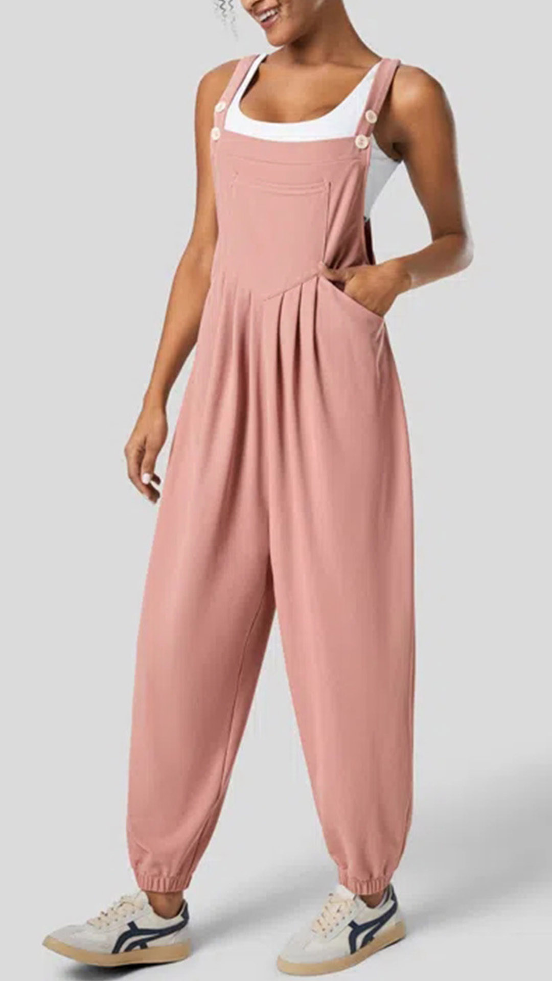 This jumpsuit features a solid color design, adding a touch of simplicity and versatility to your ensemble. The patch pockets adds a casual and laid-back vibe to your outfit. I like the pleated details along the waist, and you?