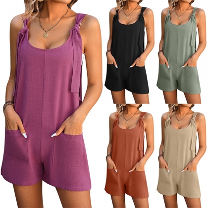 Casual Solid Color Patch Pockets Self-tie Shoulder Strap Romper