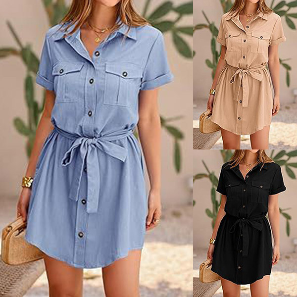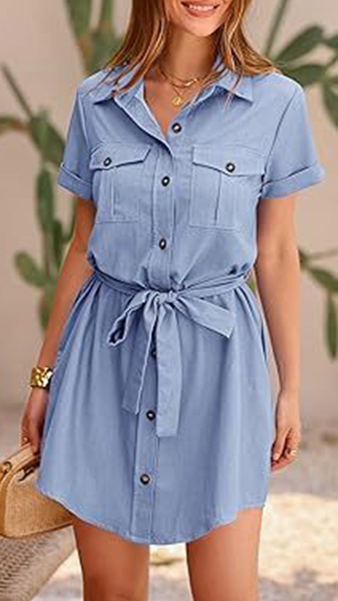 This is a versatile and stylish shirt dress that combines a solid color, patch pockets, a stand collar, short sleeves, and a self-tie waist for a fashionable and casual look. Wanna have one?