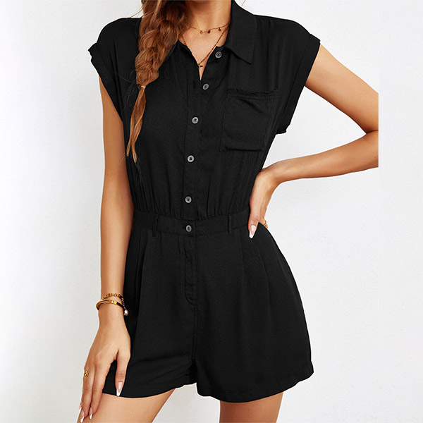 Casual Solid Color Polo Neck Buttoned Cap Sleeve Romper