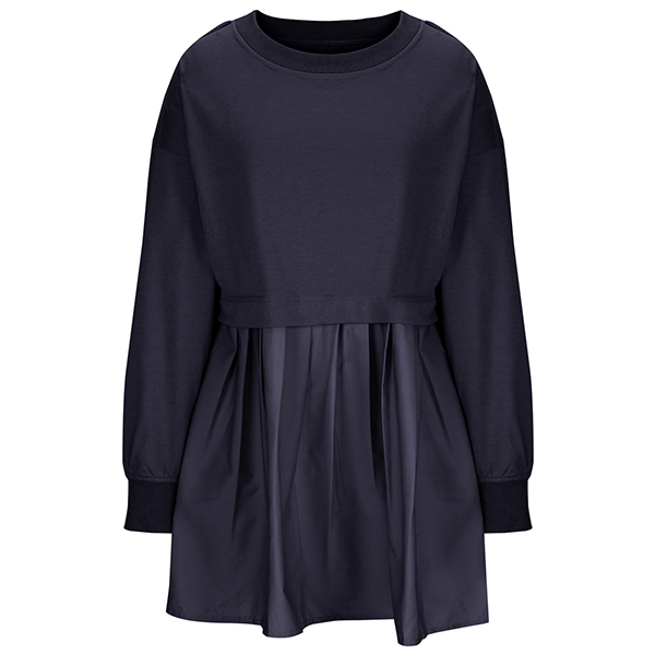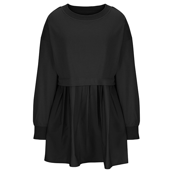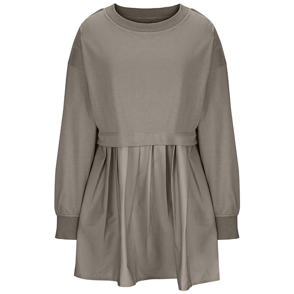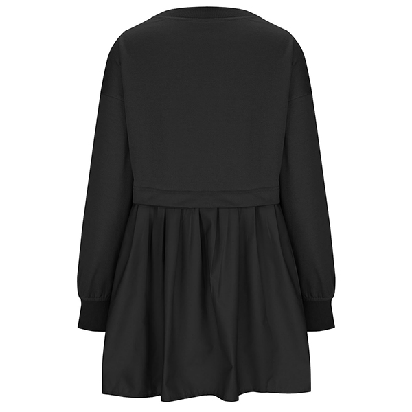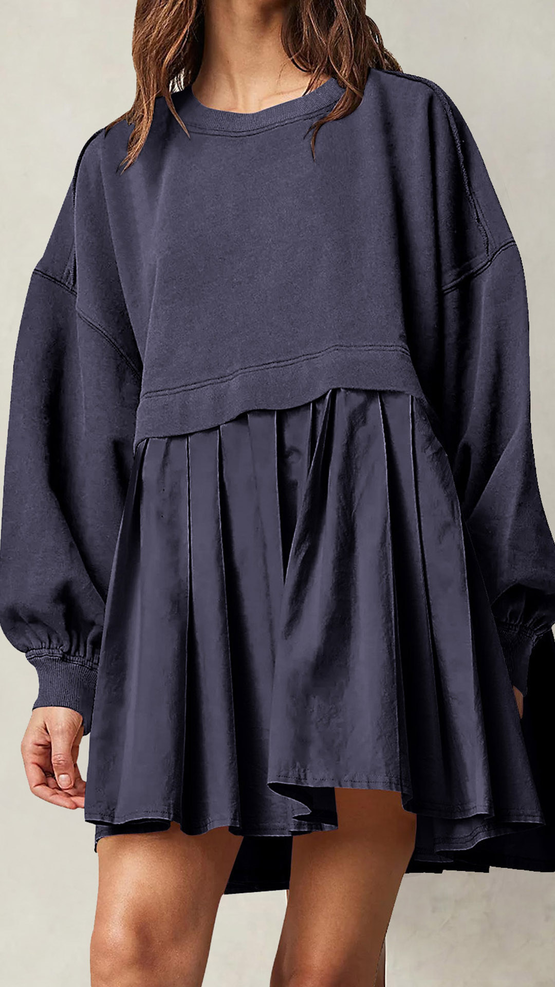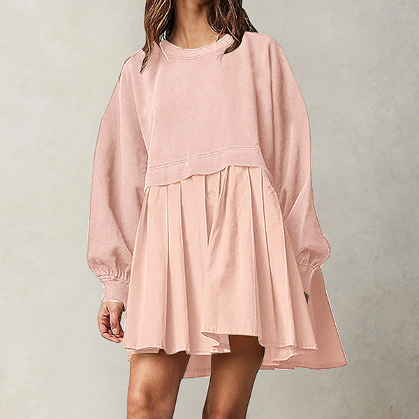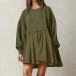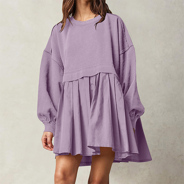 Casual Solid Color Round Neck Long Sleeve Tiered Pleated Loose Mini Dress