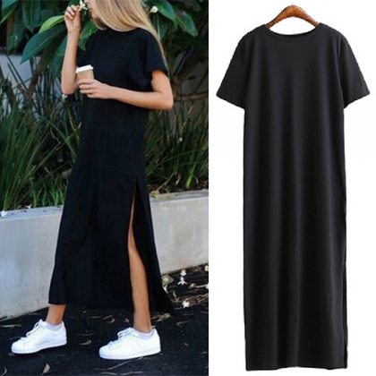 Casual Solid Color Round Neck Short Sleeve Side Slit Dress