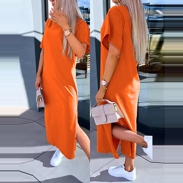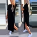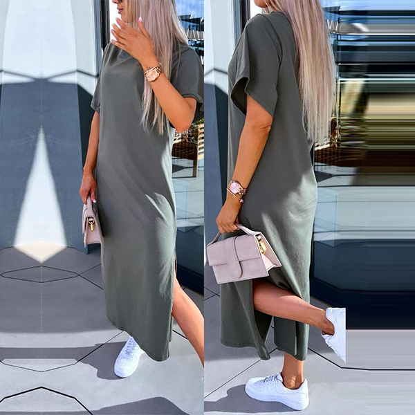 This maxi dress features a classic round neckline that offers a timeless and flattering style. I like the side slit design for a casual and chic look. And you?