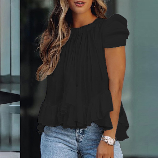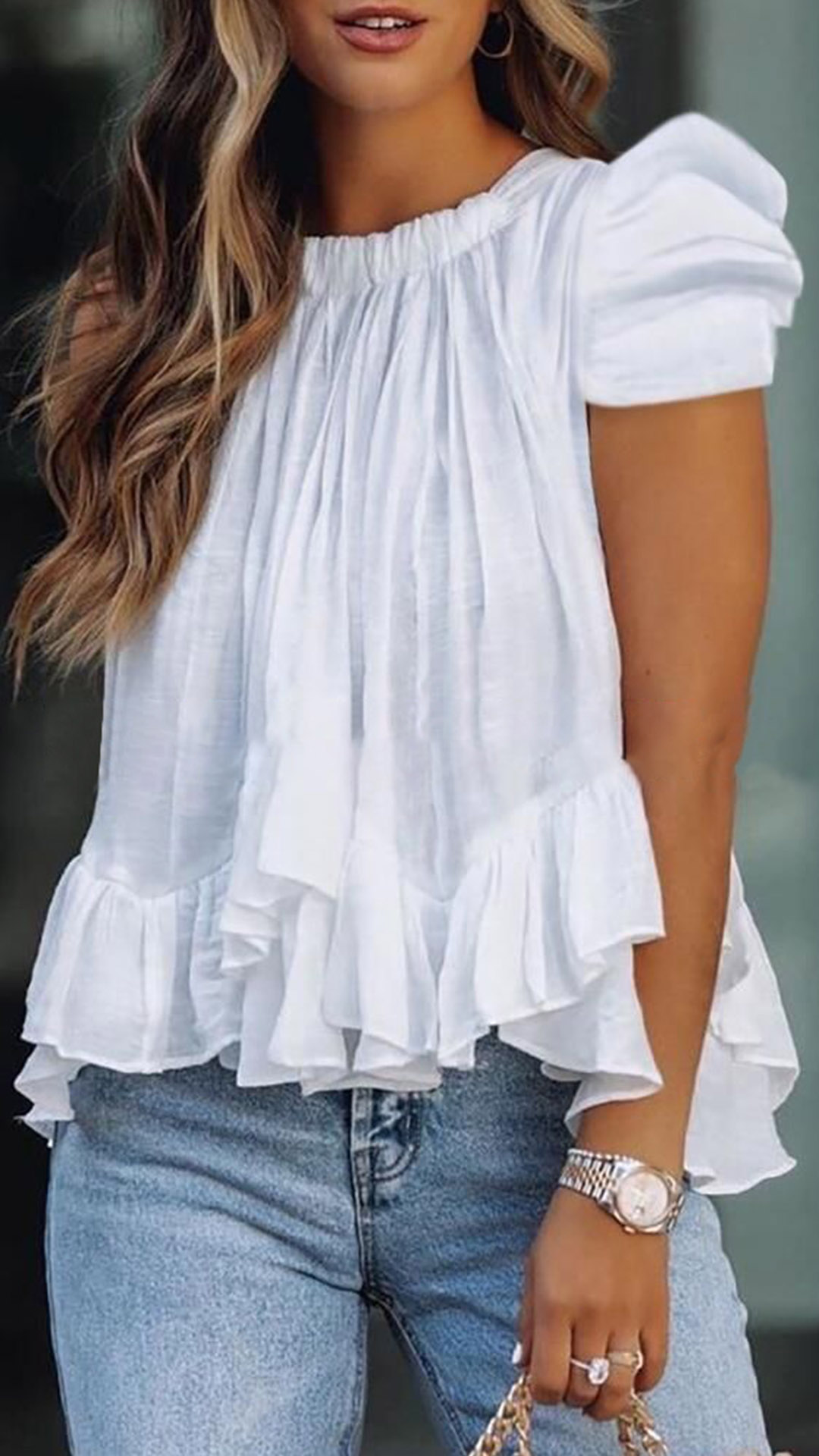 Casual Solid Color Ruffled Short Sleeve Shirt