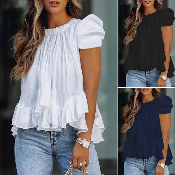 This solid color shirt is perfect for a casual look. The ruffled sleeves add a touch of femininity, while the short sleeves keep it cool and comfortable.