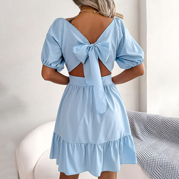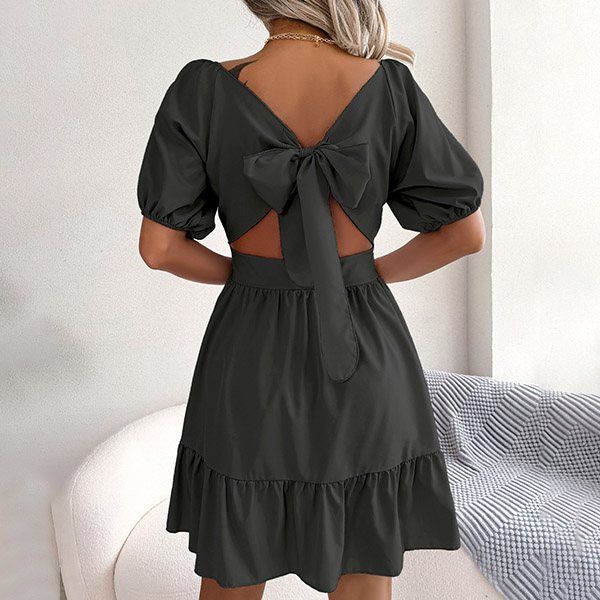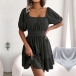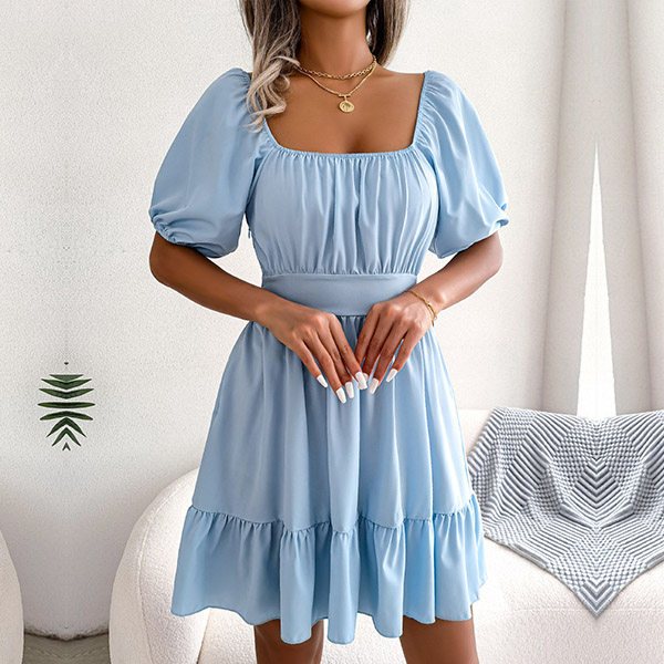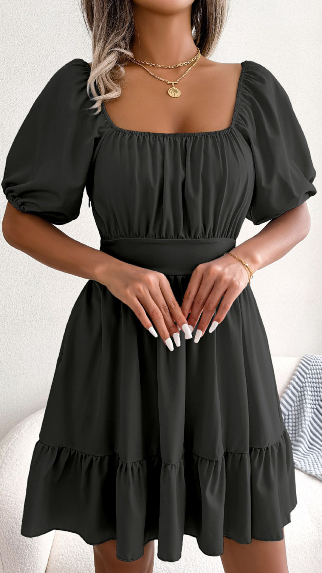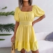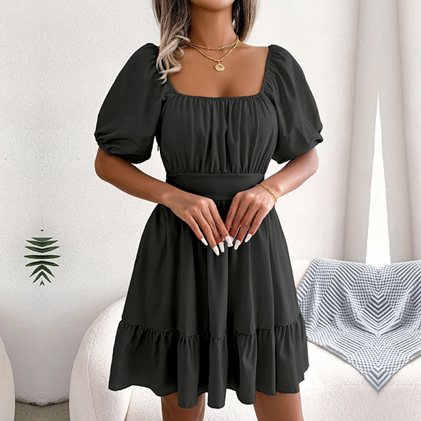 Casual Solid Color Scoop Neck Short Sleeve High-waist Ruffled Hemline Tiered Dress