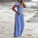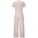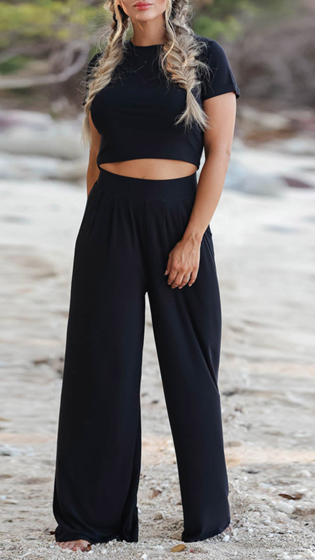 This set is perfect for a casual day out or in. The crop top has a short sleeve and a round neck. The pants are wide leg design, comfortable and fashionable. The set is made of a stretchy material for a comfortable fit.