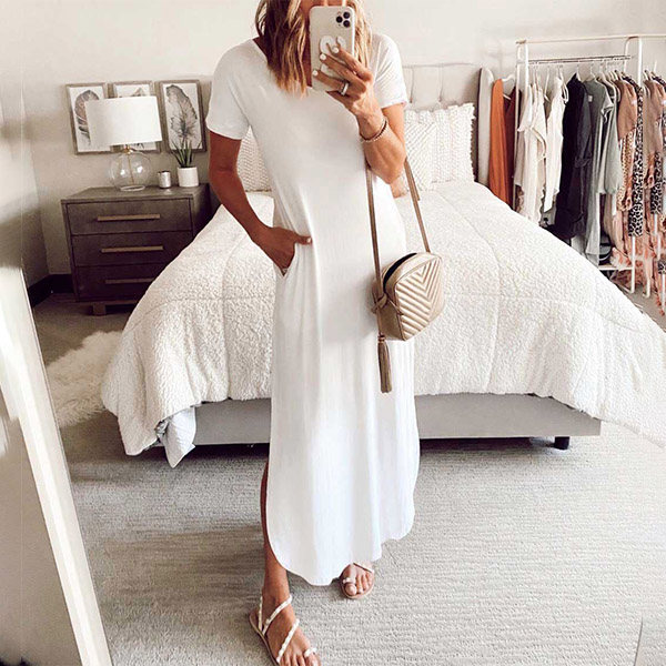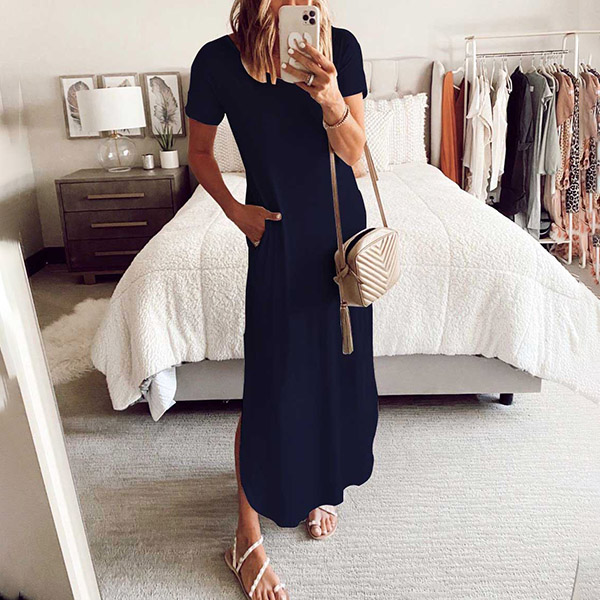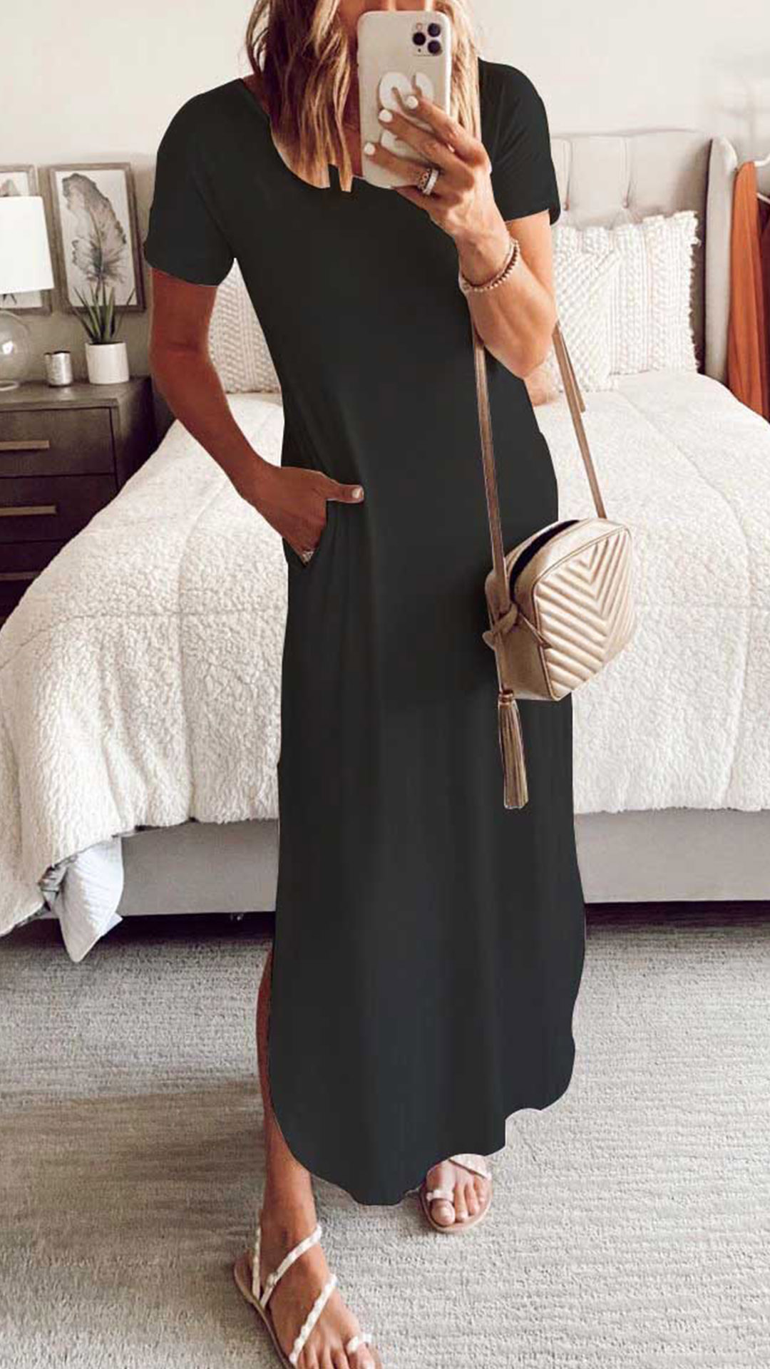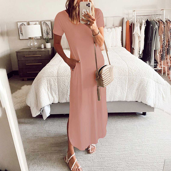 Casual Solid Color Short Sleeve Side Pockets Long Dress