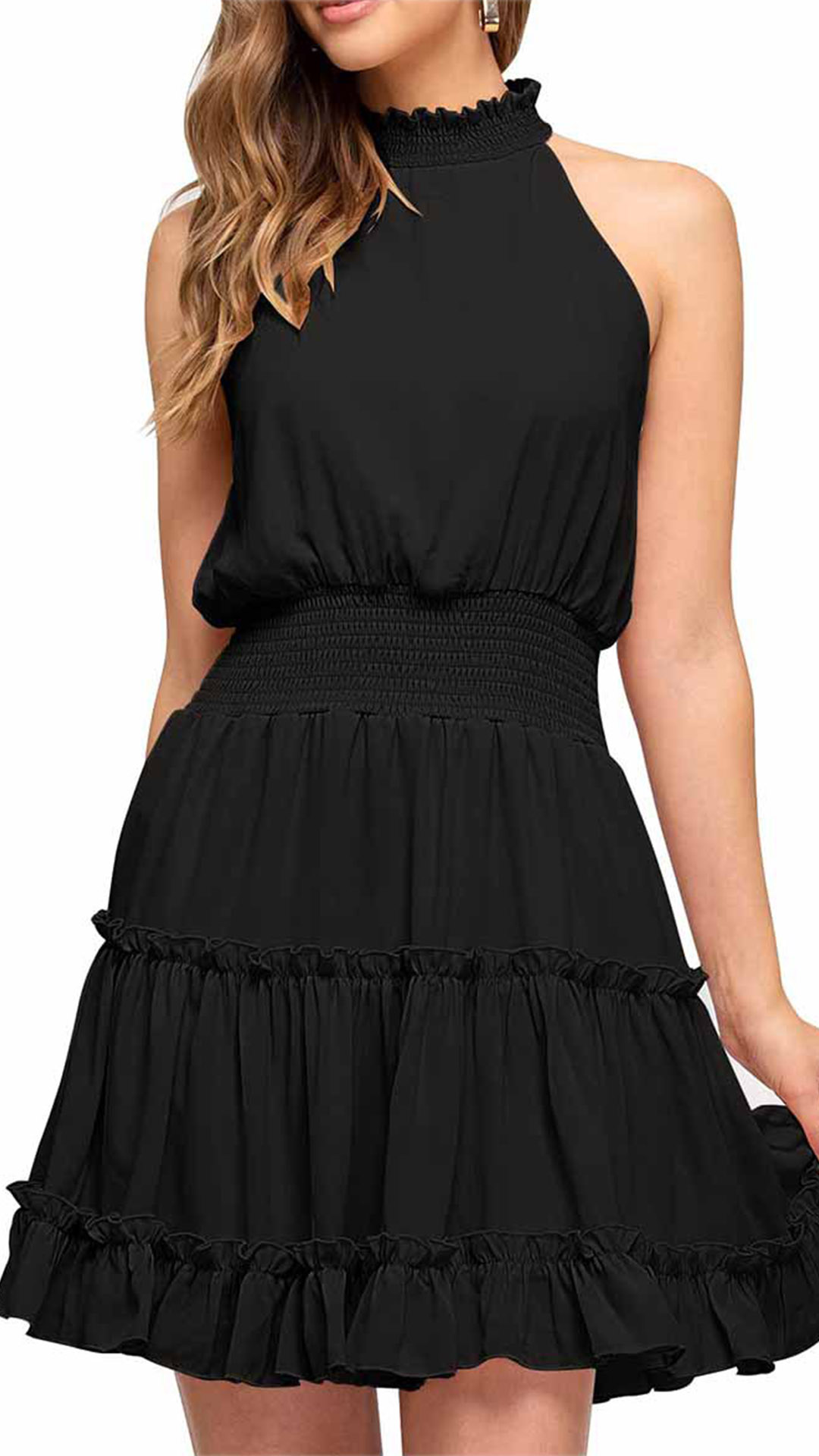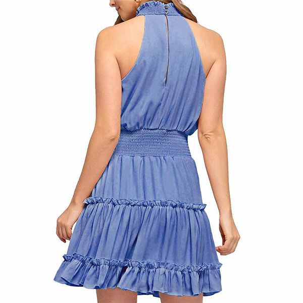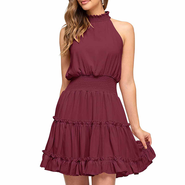 This is a beautiful and casual solid color sleeveless dress with a mocked neck and tiered skirt. Smocked waistline design shows your figure perfectly. The dress is available in several different colors, so you can choose the one that best suits your style.
