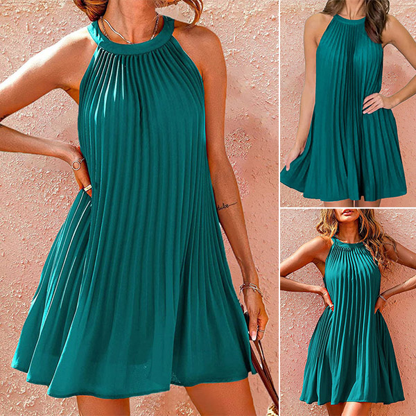 Mini dress featuring solid color, sleeveless, round neck and pleated details. Made of soft material for a ultra comfort.