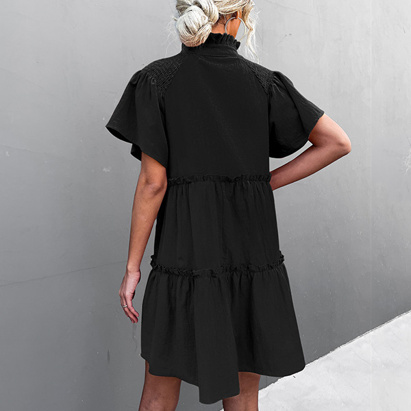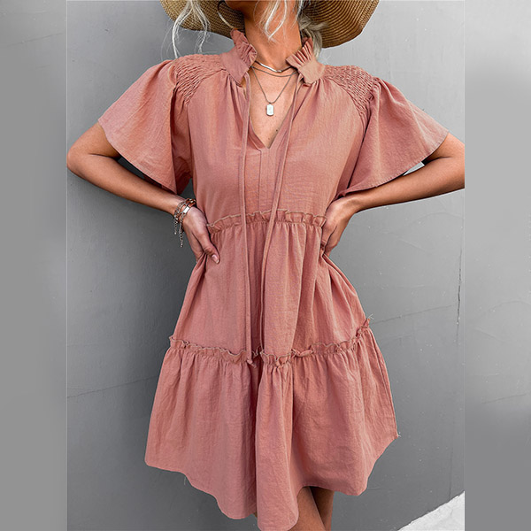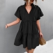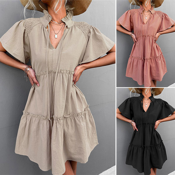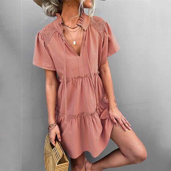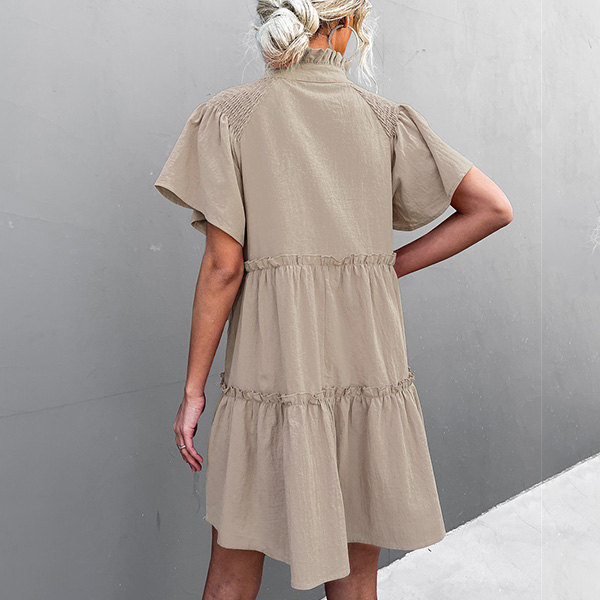 Casual Solid Color Slit V-neck Drawstring Stand Collar Tiered Loose Dress