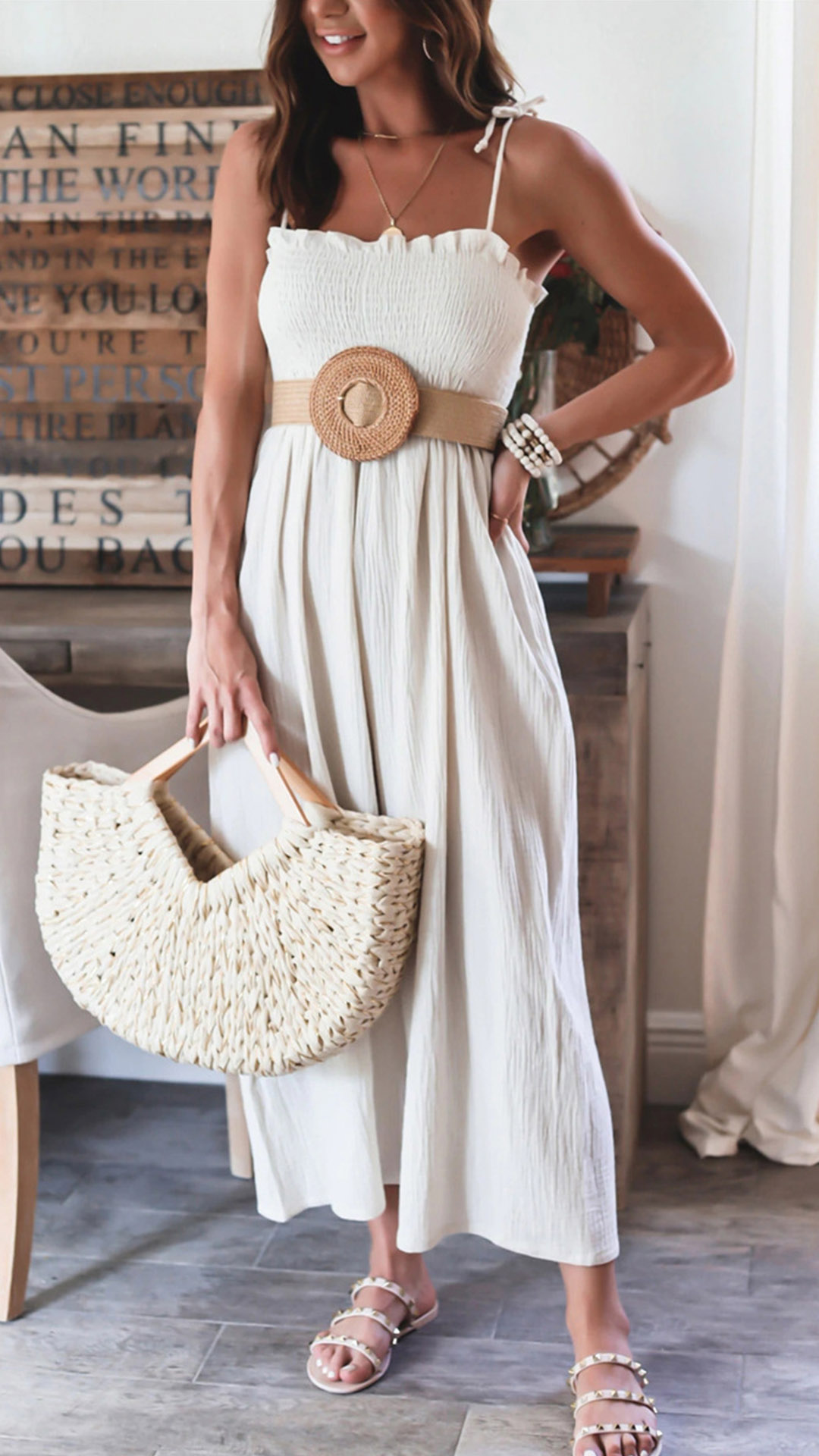 This jumpsuit features solid color design, smocked bodice, loose fit, and cami-style jumpsuit for a casual and trendy look.