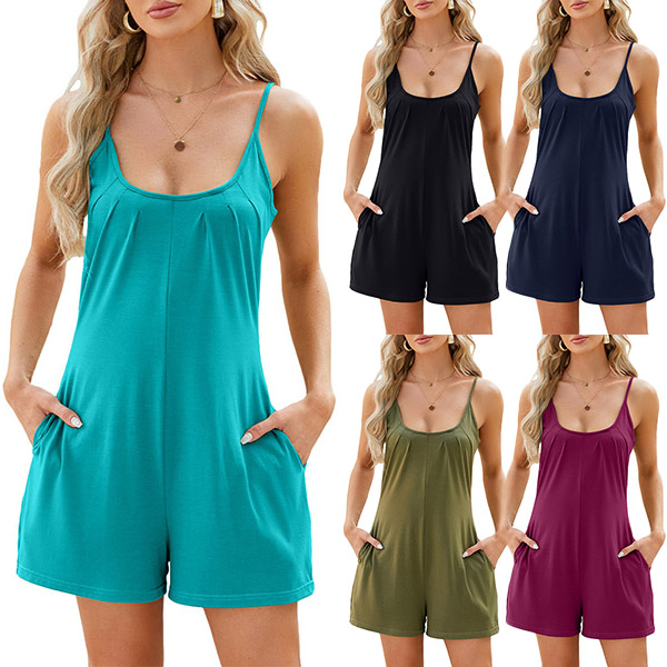 This romper features a square neckline, ruched detailing, and side pockets for a stylish and casual look.
