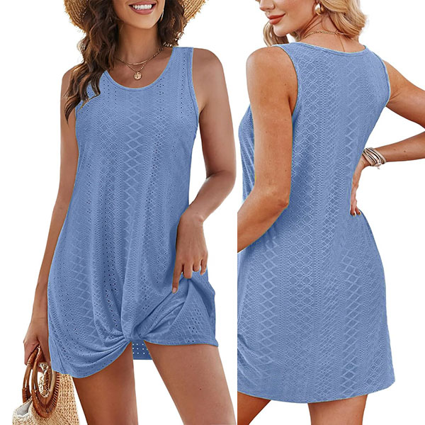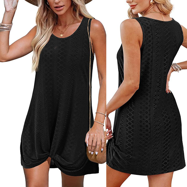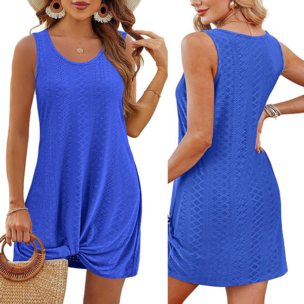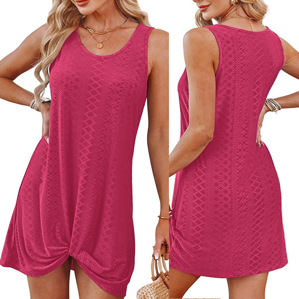 How about this mini dress? The flattering square neckline frames your collarbone beautifully, while the sleeveless cut offers effortless summer style. A subtle knot detail adds interest and creates a figure-enhancing silhouette. Multi-colors avabile.
