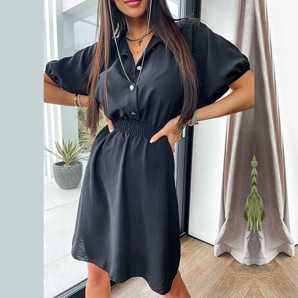 Casual Solid Color Stand Collar Buttoned Short Sleeve Smocked Waist Mini Dress