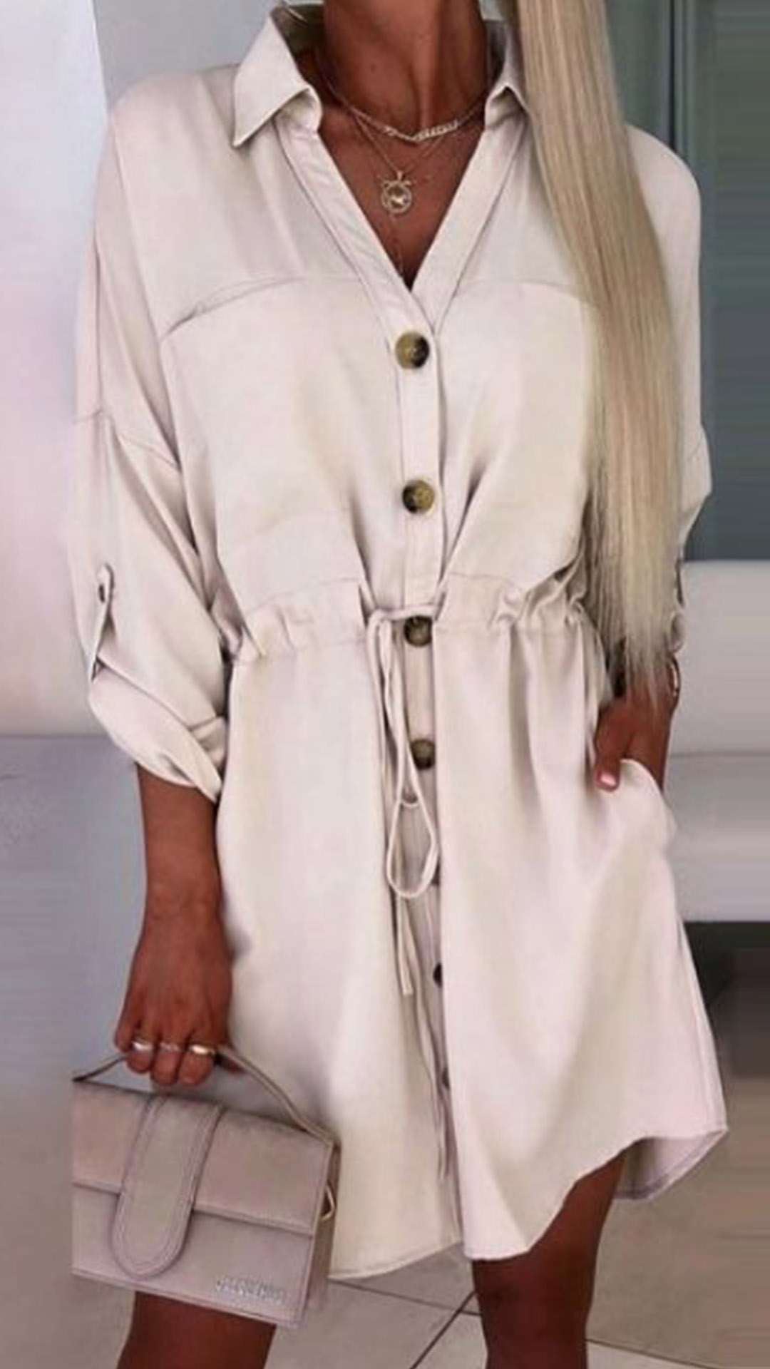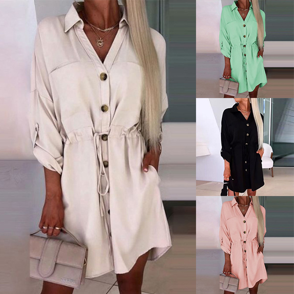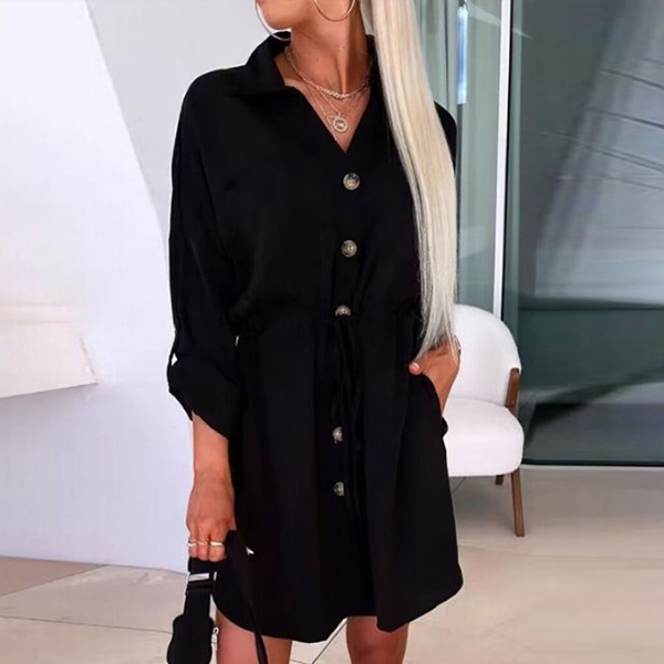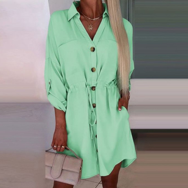 This dress combines the comfort of a shirt with the elegance of a dress, creating a versatile and chic ensemble. The solid color adds a timeless touch, while the stand collar and buttoned V-neckline add sophistication and refinement. The drawstring at the waist allows you to adjust the fit, creating a flattering silhouette. With its long sleeves, this dress is suitable for transitioning seasons and provides coverage without compromising style.