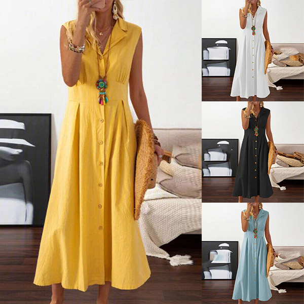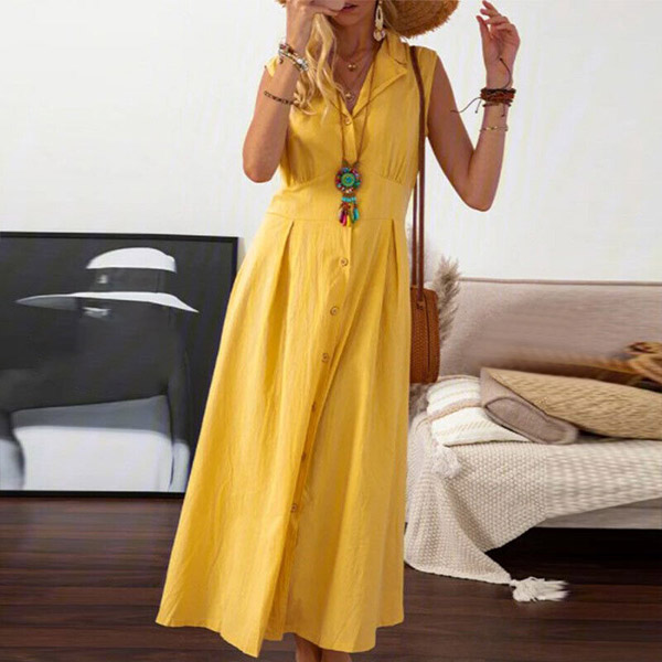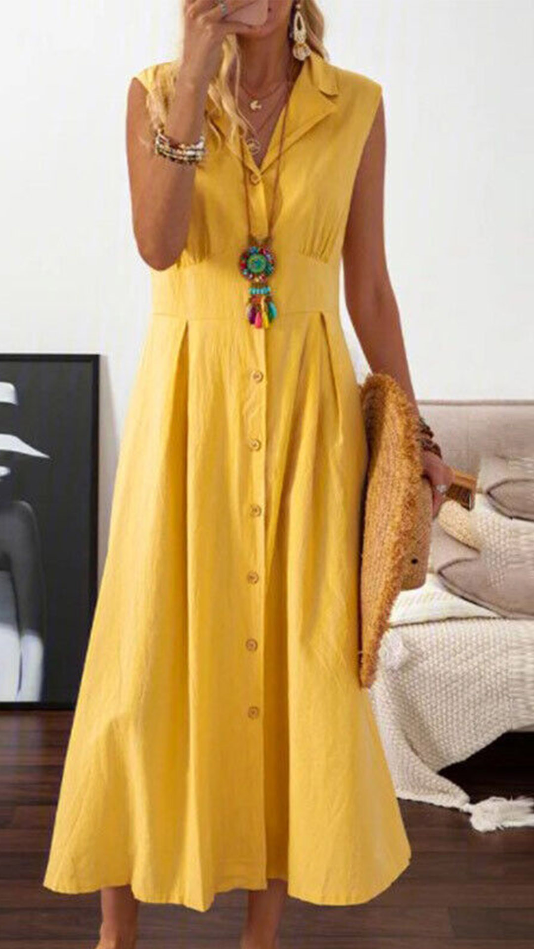 Casual Solid Color Stand Collar Buttoned V-neck Sleeveless Midi Dress