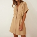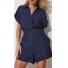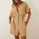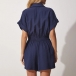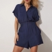 Casual Solid Color Stand Collar V-neck Cinch Waist Short Sleeve Romper