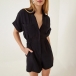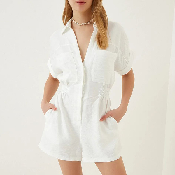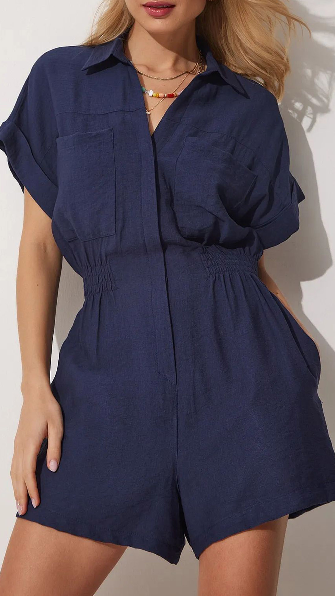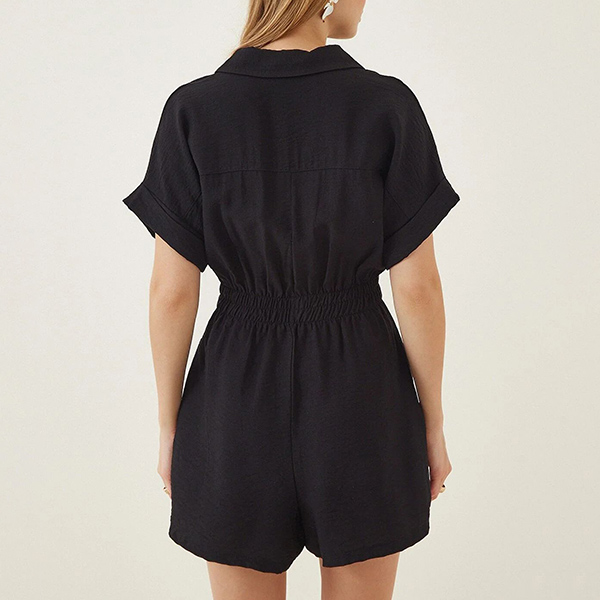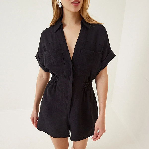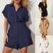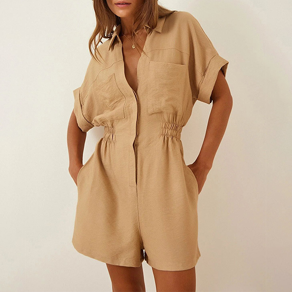 This romper features a solid color design with a stand collar and V-neckline for a casual and stylish look. The cinched waist and short sleeves create a flattering silhouette, while the comfortable and breathable fabric keeps it casual and versatile. Perfect for a day out or a casual gathering, this romper is sure to become a go-to in your wardrobe.