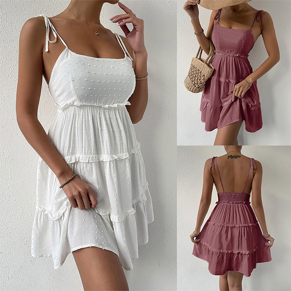 This is a beautiful, feminine dress that is perfect for a casual day out. The dress is a solid color with a Swiss dot design and tiered skirt. The slip dress is comfortable and easy to wear, and the tiered skirt adds a touch of elegance.