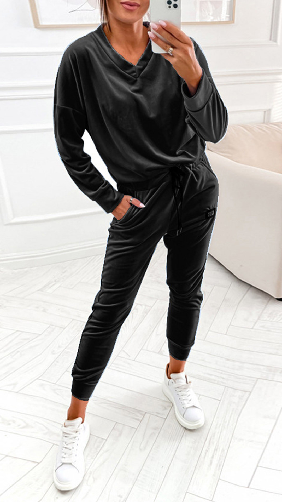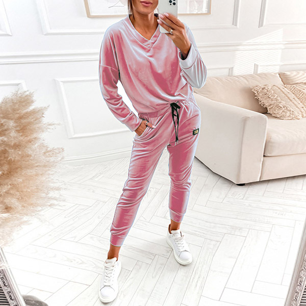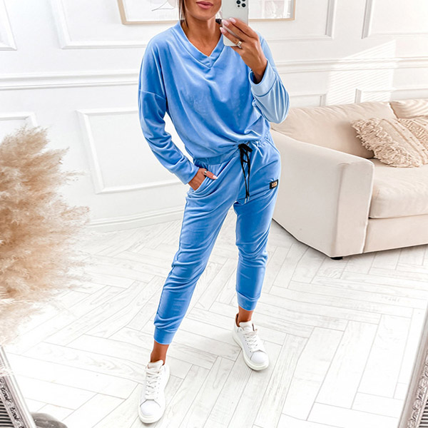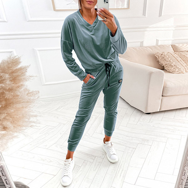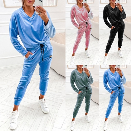 Casual Solid Color Two-piece Set Consist of V-neck Shirt and Drawstring Pants