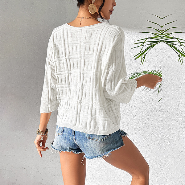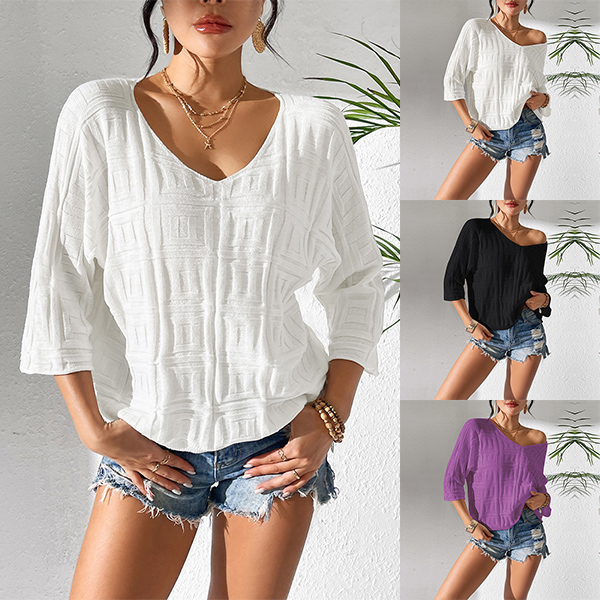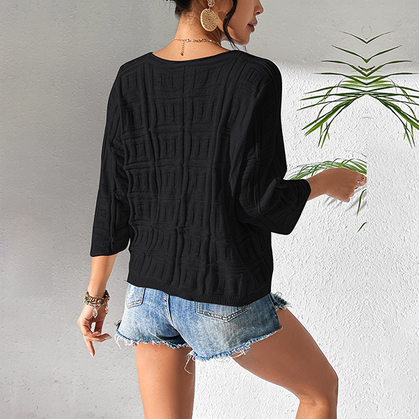Casual Solid Color V-neck 3/4-Sleeve Loose Knitted Shirt