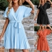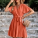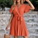 Casual Solid Color V-neck Pleated Self-tie Dress
