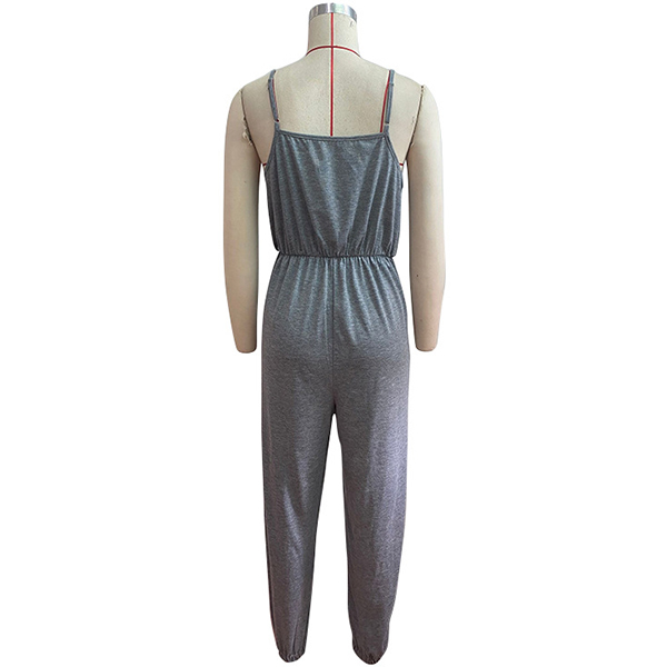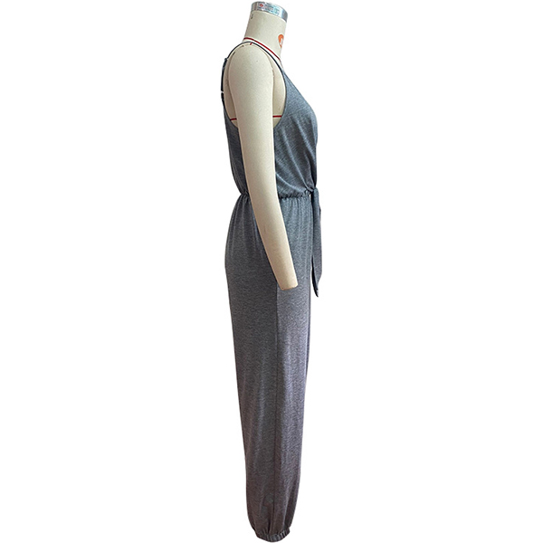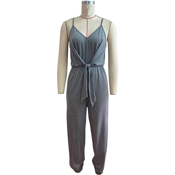 Gray jumpsuit featuring narrow shoulder strap, V-neck square cut back, self-tie waistline, elastic cuff, and soft and comfortable material.