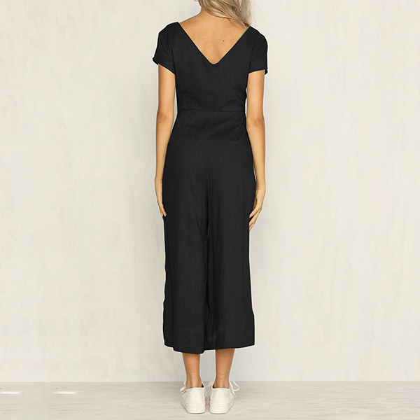 Casual Solid Color V-neck Short Sleeve Button Jumpsuit
