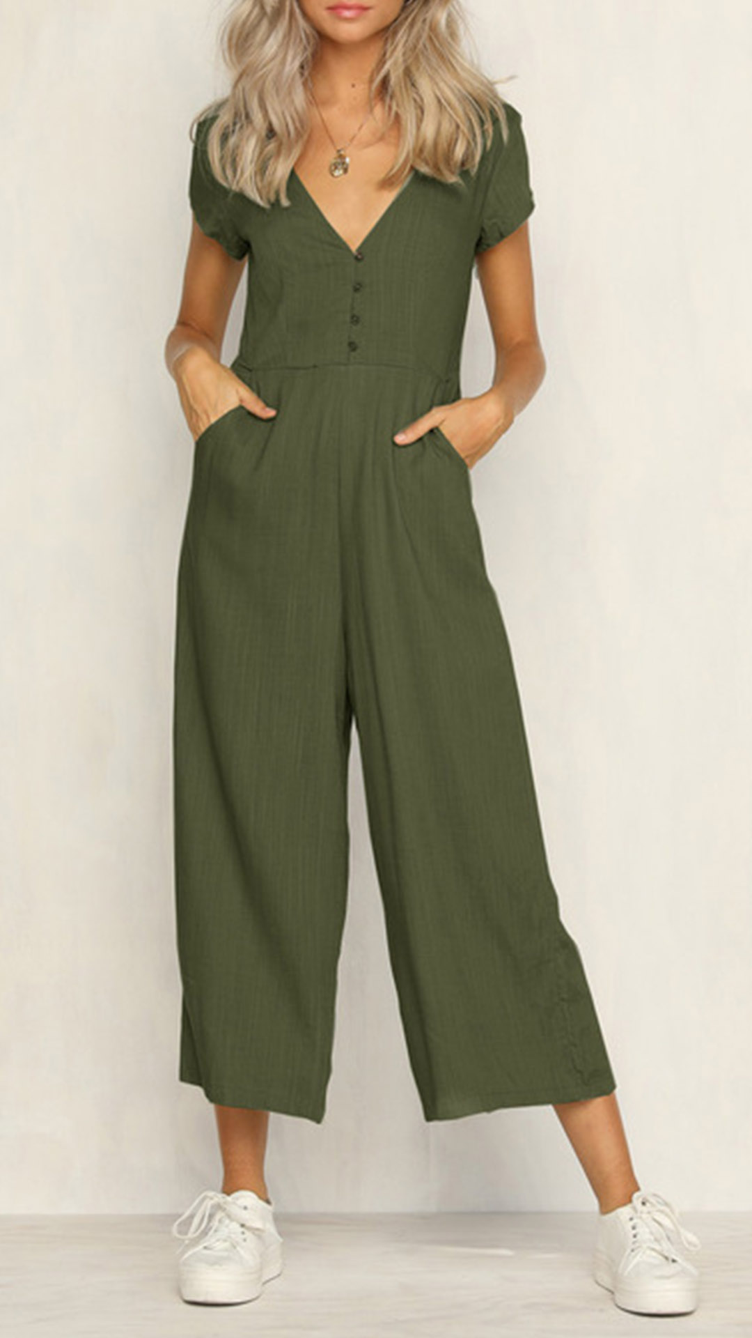 This jumpsuit is perfect for warmer weather or when you want to create a more casual and laid-back look. It features a flattering V-neckline, short sleeves, button detailing, and a solid color design, offering a chic and casual look that is perfect for everyday wear.