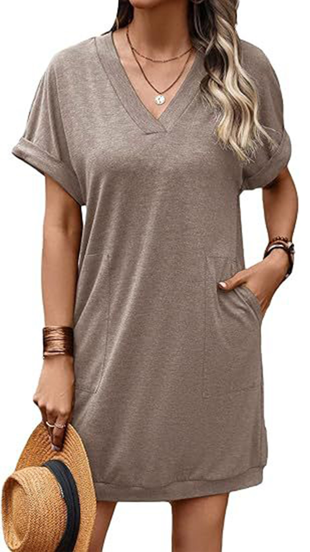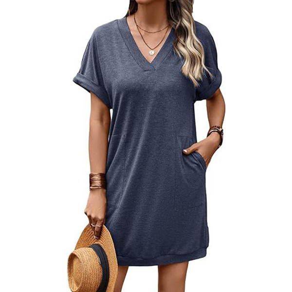 This is a simple and classic design with a flattering V-neckline and short sleeves for a chic and effortless look. Pair it with sandals and a sun hat for a casual and summery outfit.