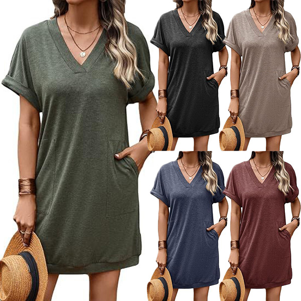 Casual Solid Color V-neck Short Sleeve Mini Dress