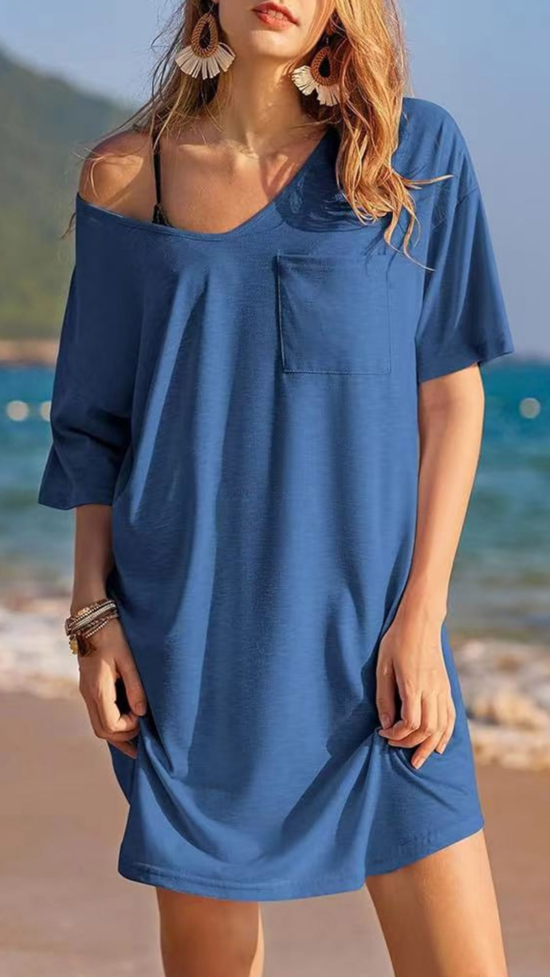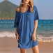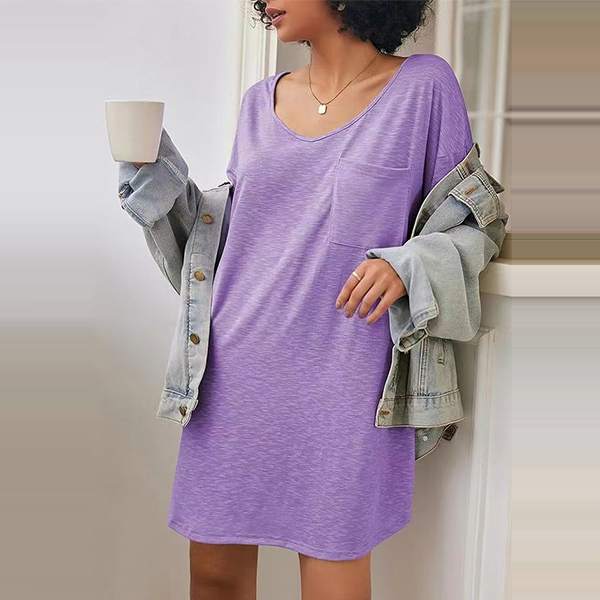This casual mini dress features a solid color design, a V-neckline, and short sleeves, perfect for a simple and versatile look. Multi-colors available.