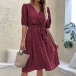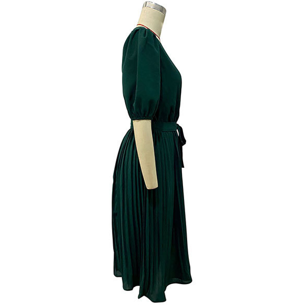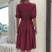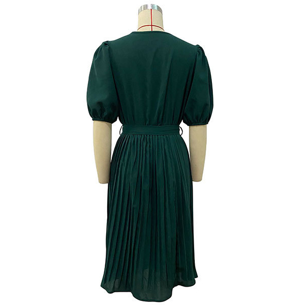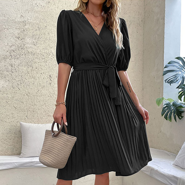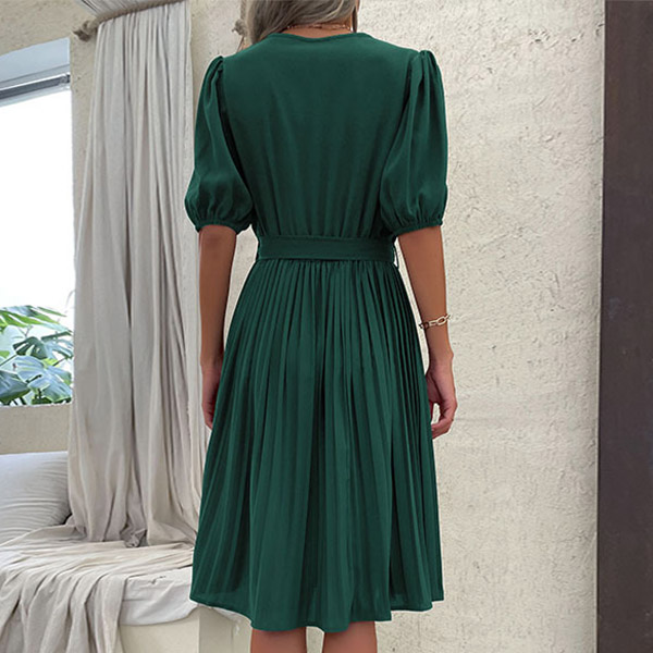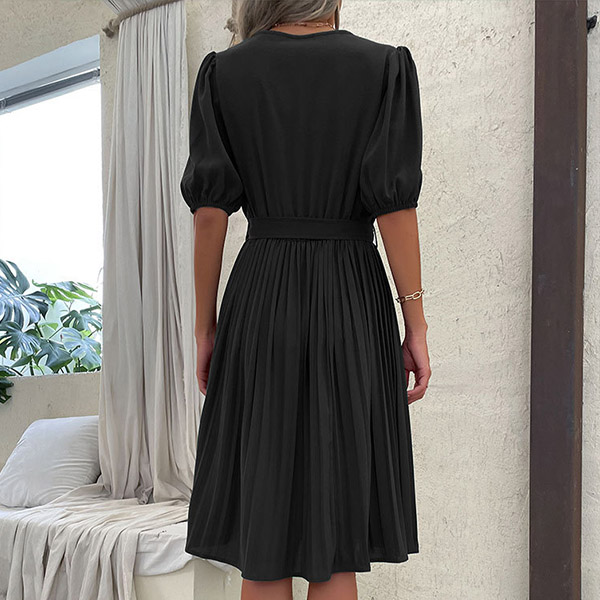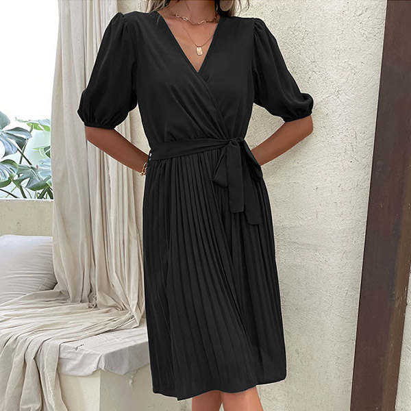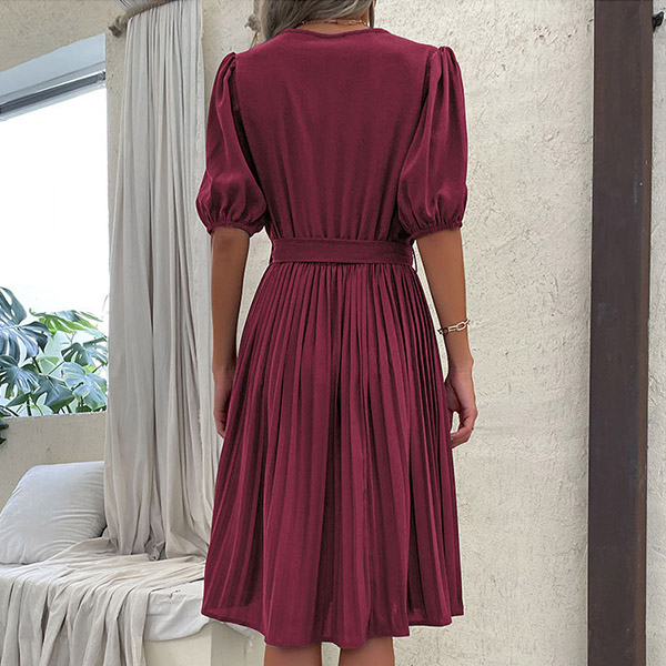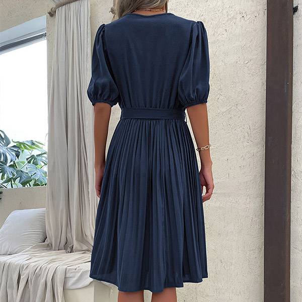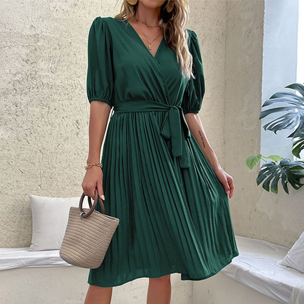 Casual Solid Color V-neck Short Sleeve Pleated Self-tie Dress