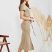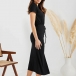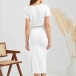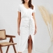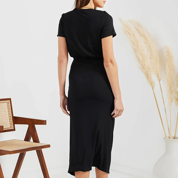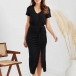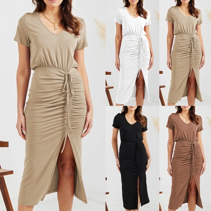 How about this dres? The solid color makes it versatile and easy to pair with any accessories. The ruched drawstring skirt gives it a flattering silhouette and the slit design adds a touch of sass. The V-neck and short sleeves add a touch of femininity and the bodycon fit ensures you look your best. Whether you're heading to the office, out for drinks or just lounging around, this dress is sure to keep you looking and feeling great.