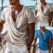 Casual Solid Color V-neck Short Sleeve Ruched Shirt for Men