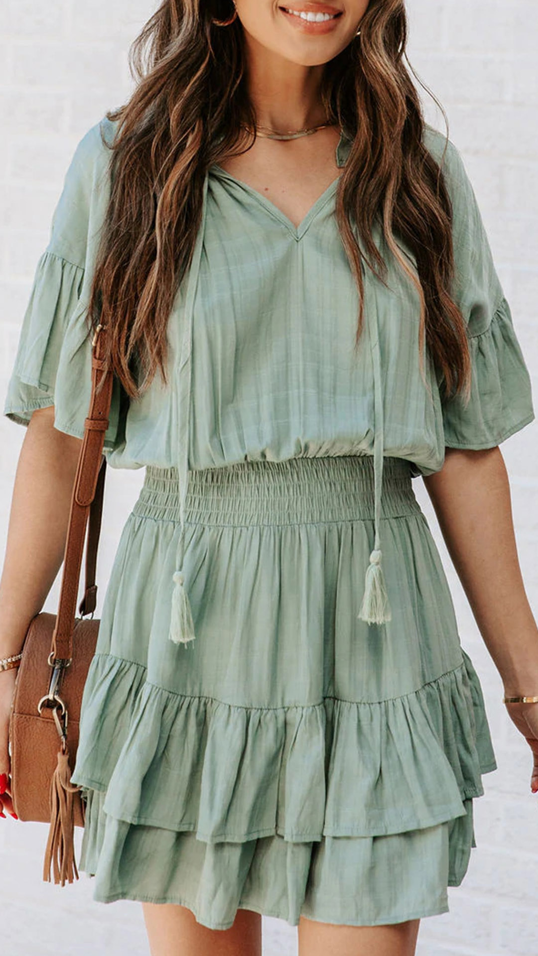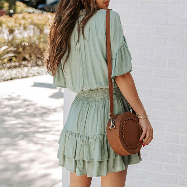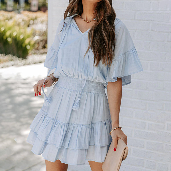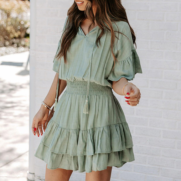 Casual Solid Color V-neck Short Sleeve Ruffled Tiered Dress