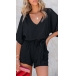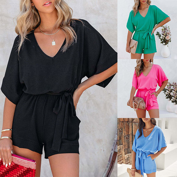 Looking for a playful and chic romper that you can wear on any casual day? Try this one! With a flattering V-neckline, short sleeves, and a self-tie waist, this romper is both stylish and comfortable.