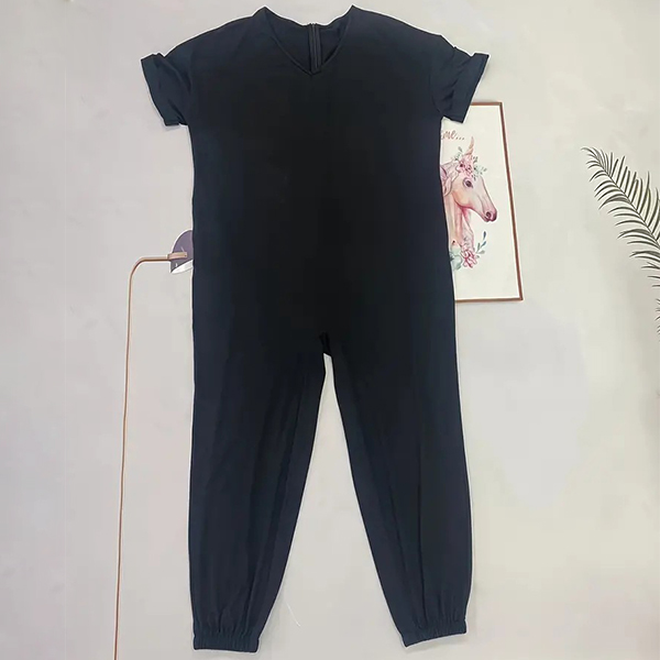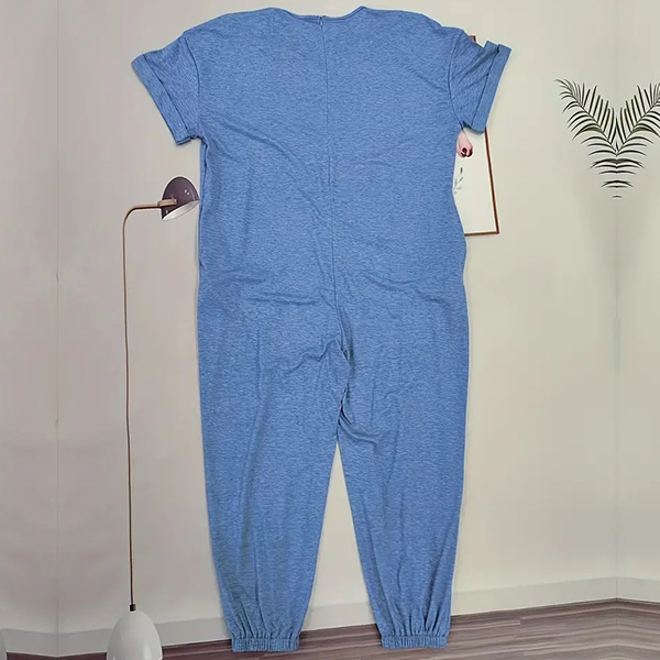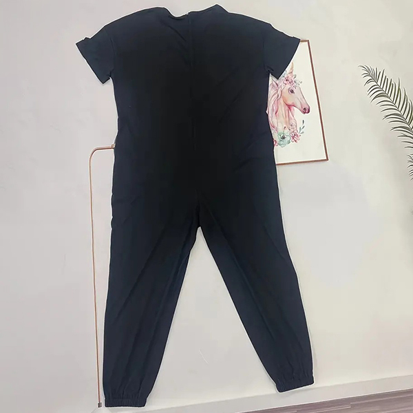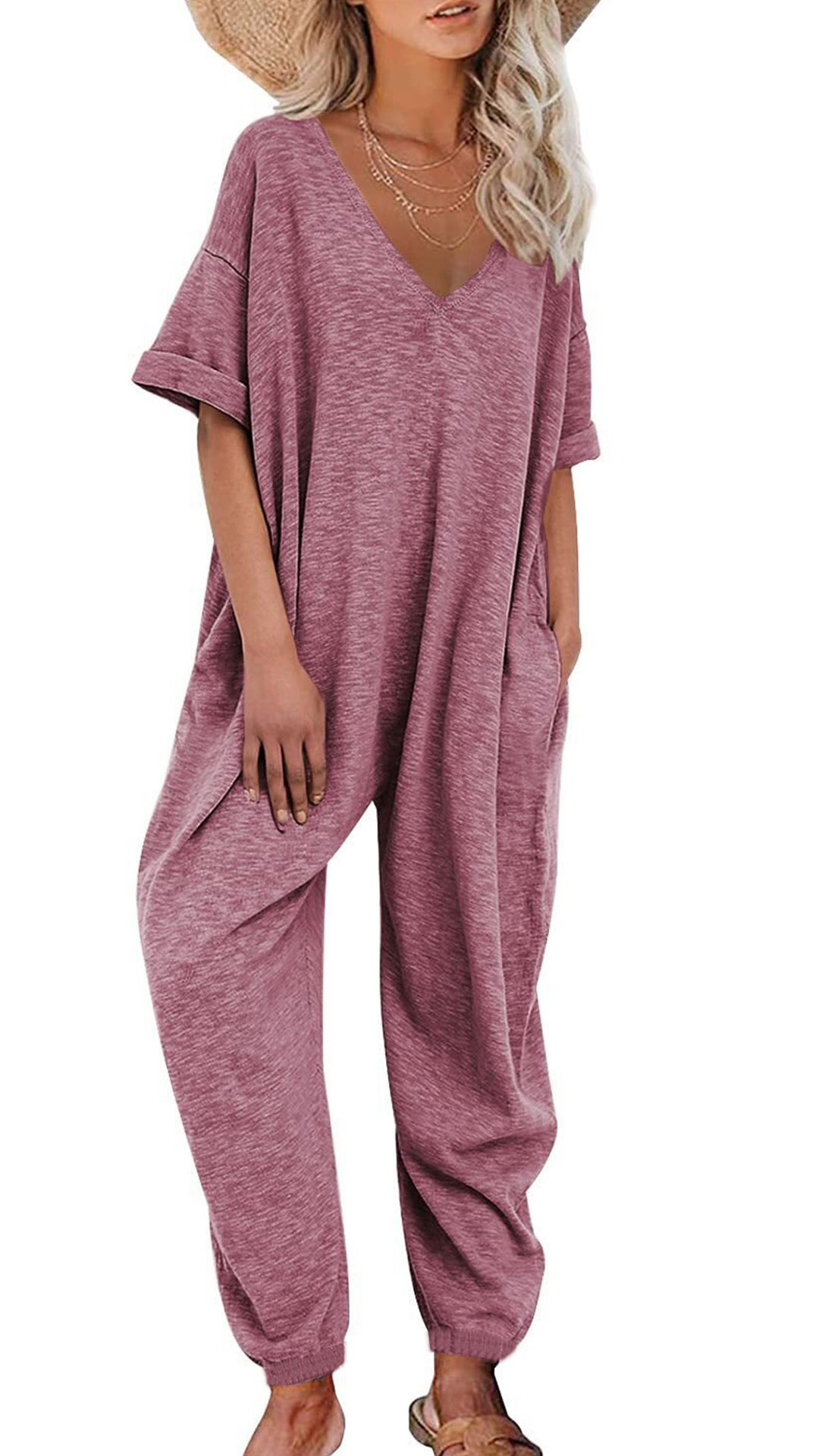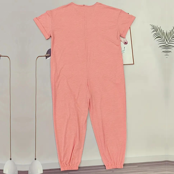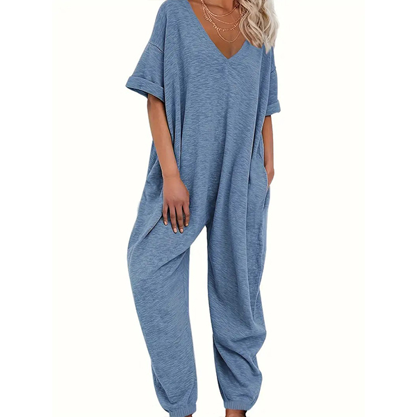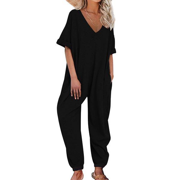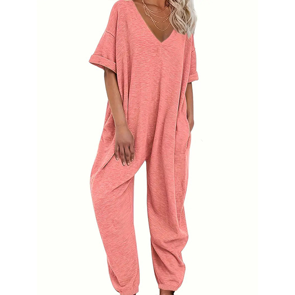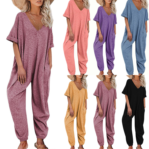 This versatile jumpsuit features a V-neckline, short sleeves, side pockets, and a loose-fitting silhouette, offering a chic and relaxed outfit option for various occasions. Multi-colors available.