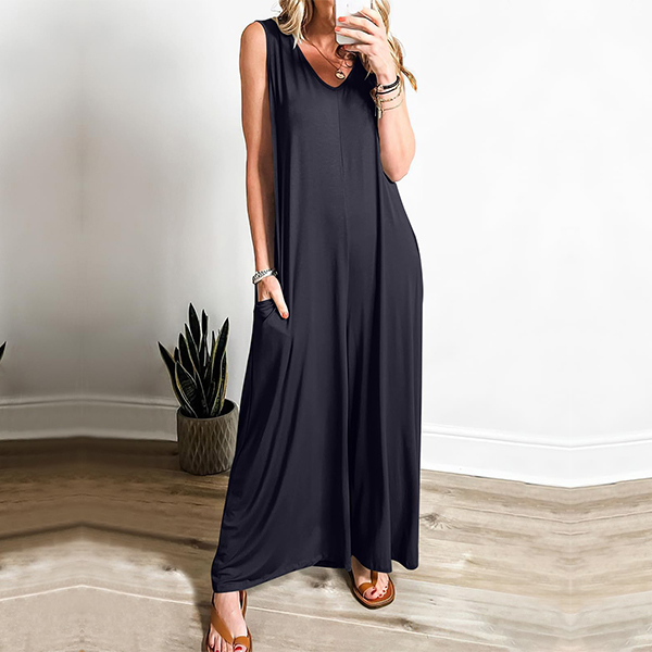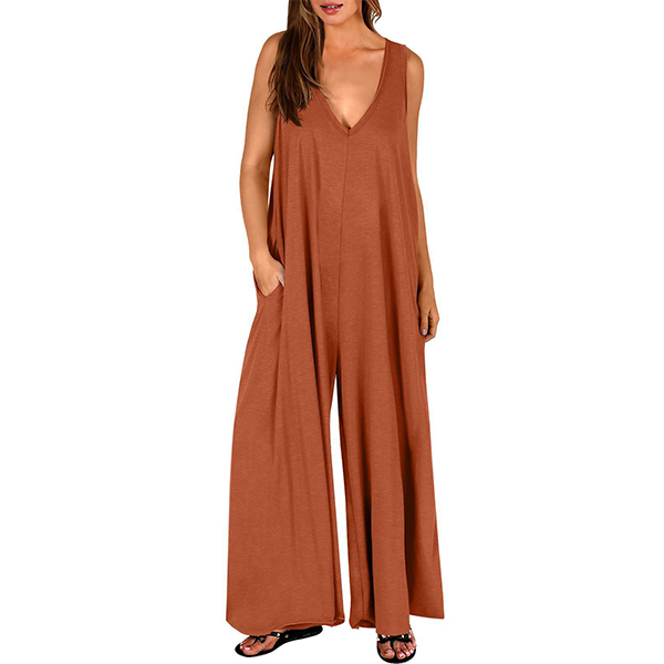 This versatile jumpsuit features a flattering V-neckline, sleeveless design, wide-leg silhouette, and a loose fit. It offers a perfect blend of casual and chic, making it an ideal choice for a variety of occasions.