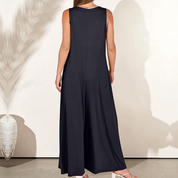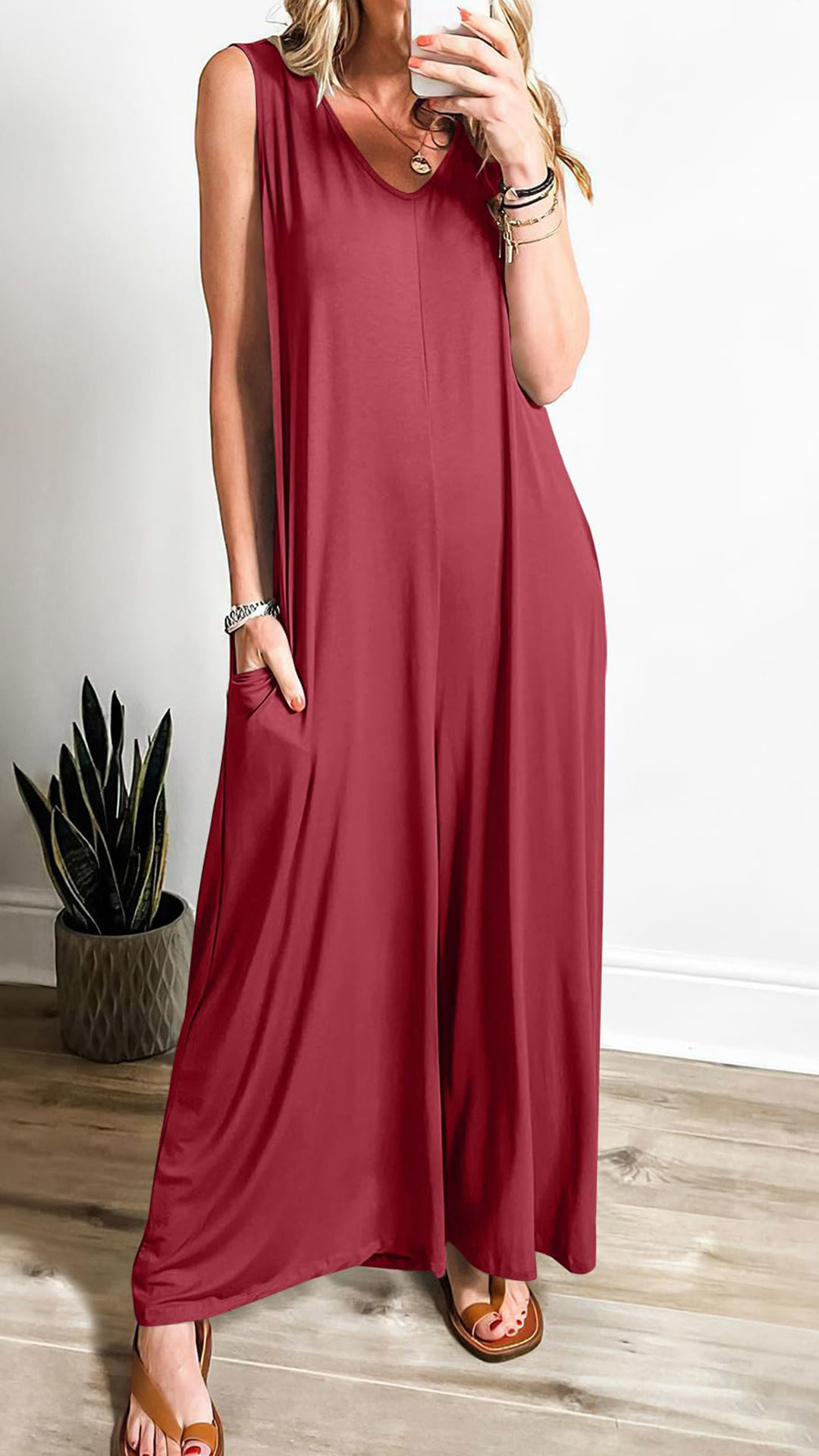 Casual Solid Color V-neck Sleeveless Wide-leg Loose Jumpsuit
