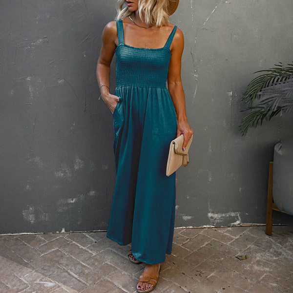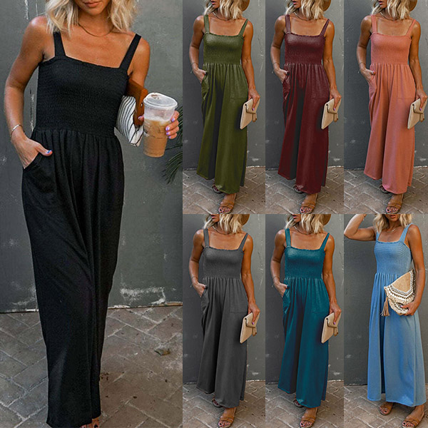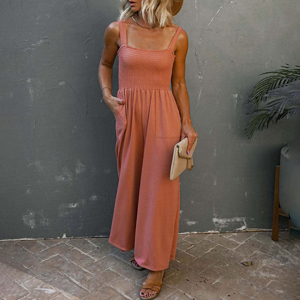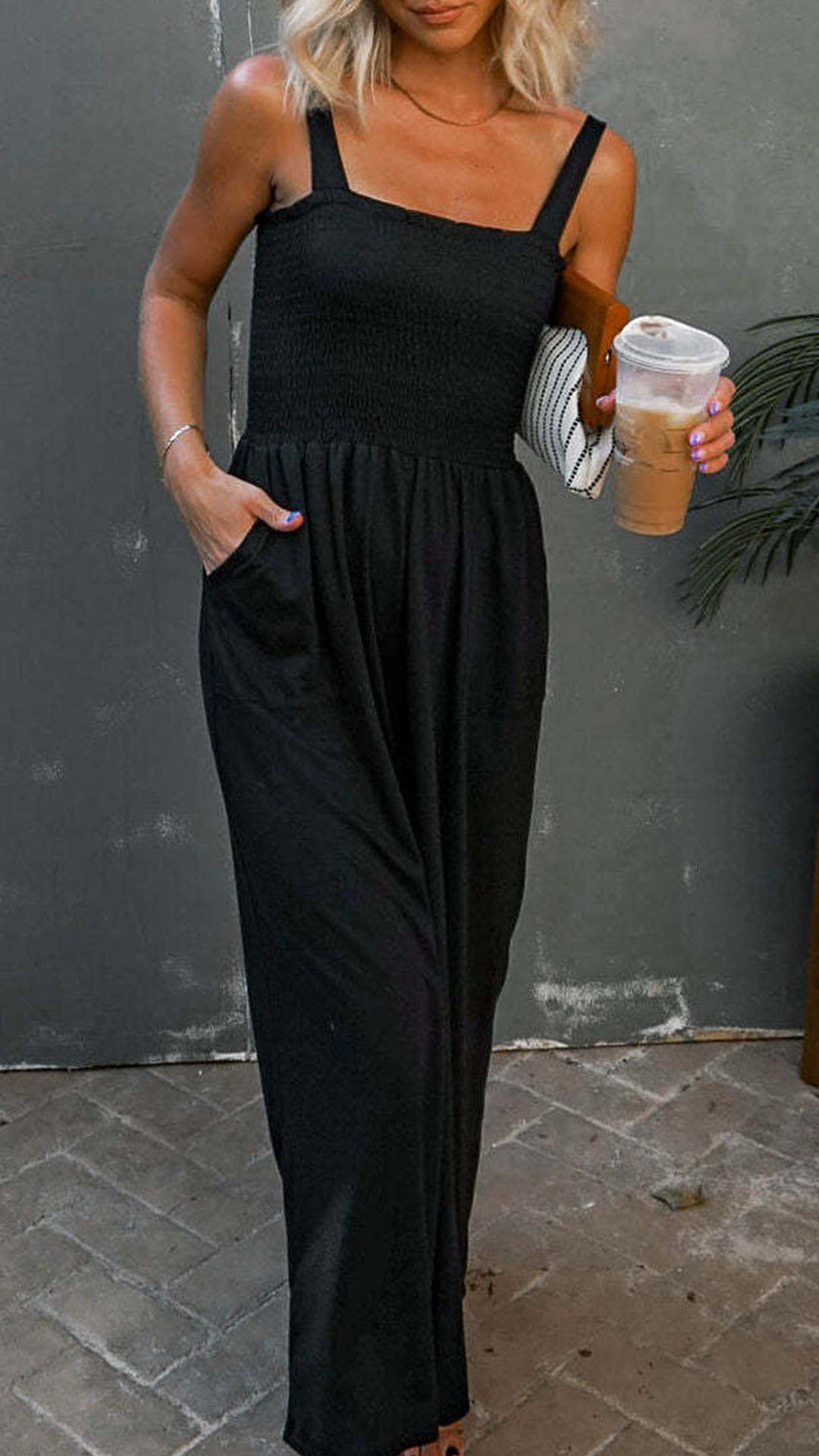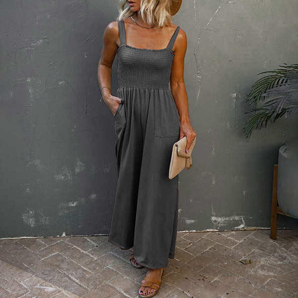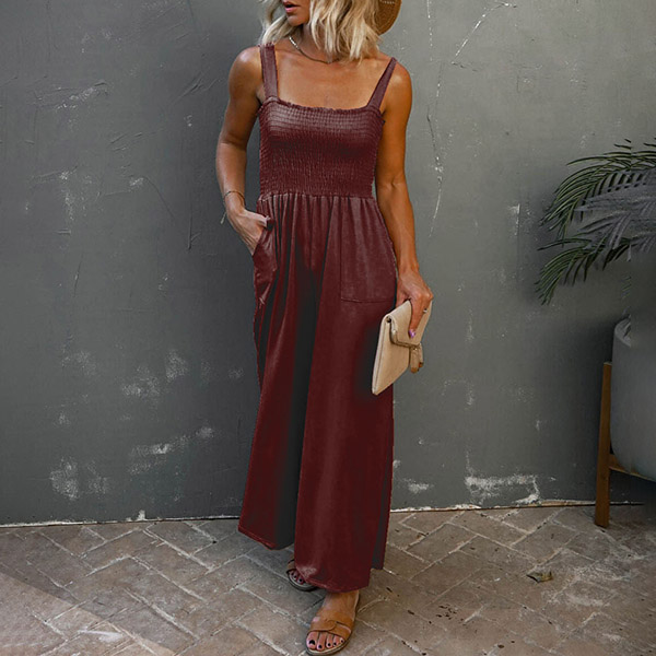 Look at this jumpsuit! The solid color design of the jumpsuit creates a classic and timeless look, while the wide-leg design provides a comfortable and relaxed fit. It is a comfortable and stylish garment that is perfect for everyday wear.