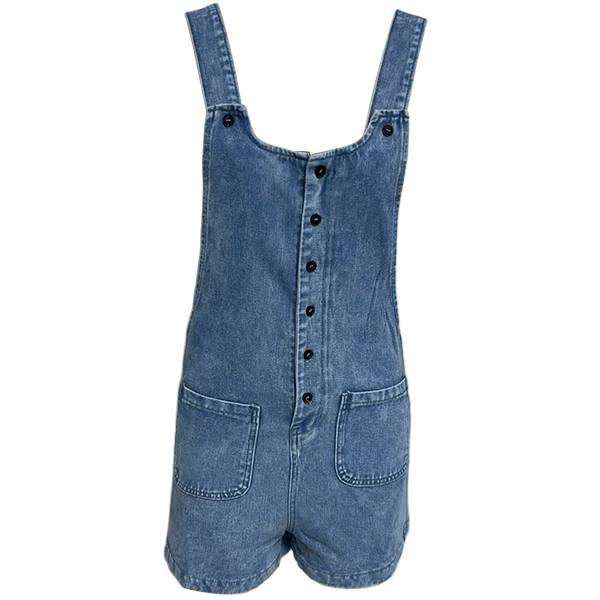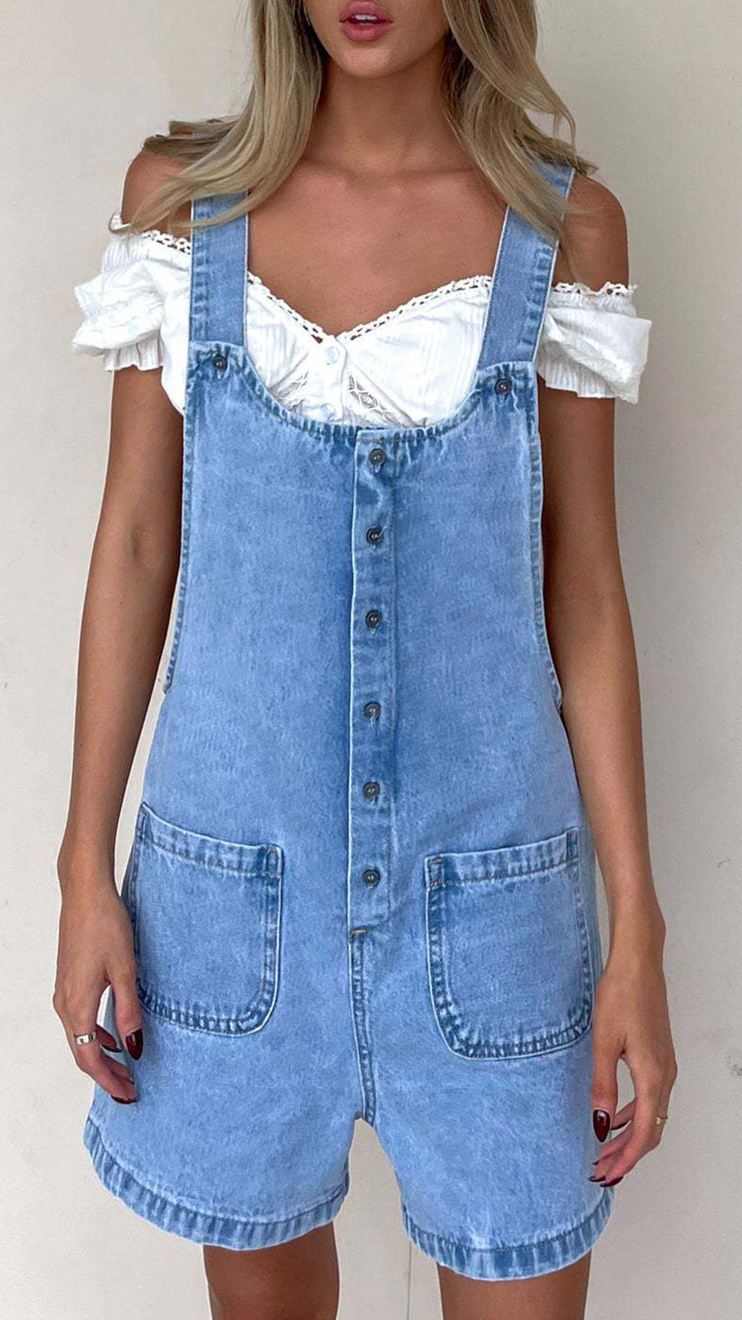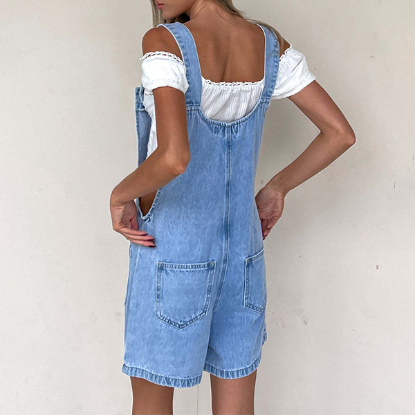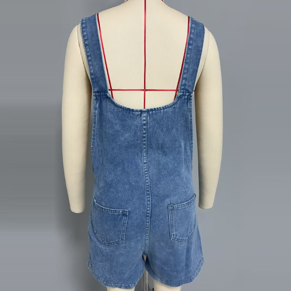 This suspender romper features a square neckline, front button closure, patch pockets, old-washed denim fabric, and suspenders for a chic and laid-back look.