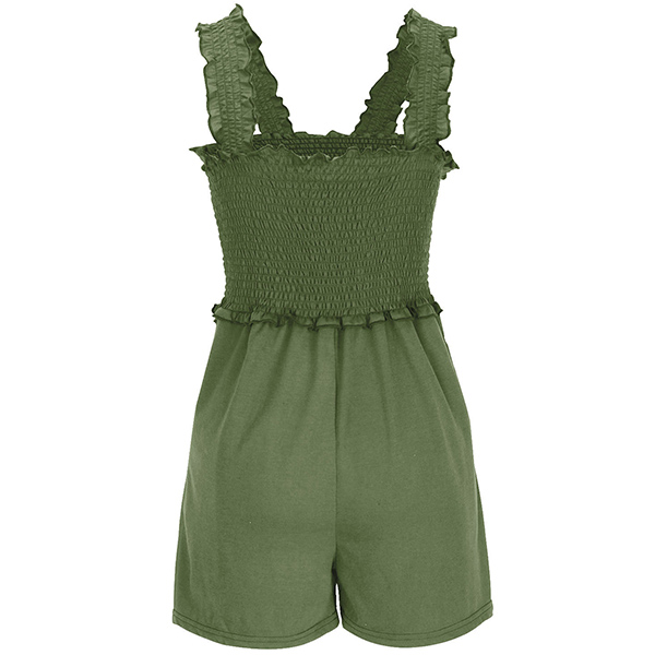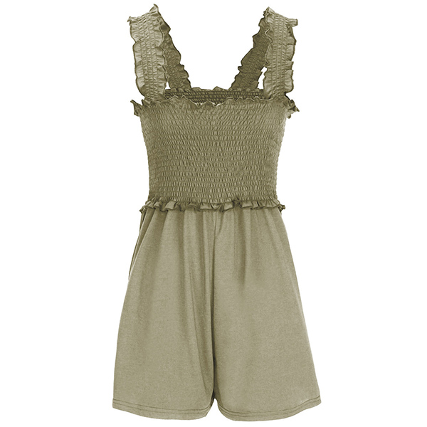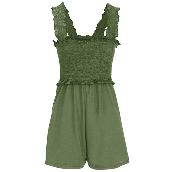 This chic and comfortable romper features a square neckline, a smocked bodice, and convenient side pockets, creating a stylish and practical ensemble for casual occasions. Pair with sandals for a laid-back look.