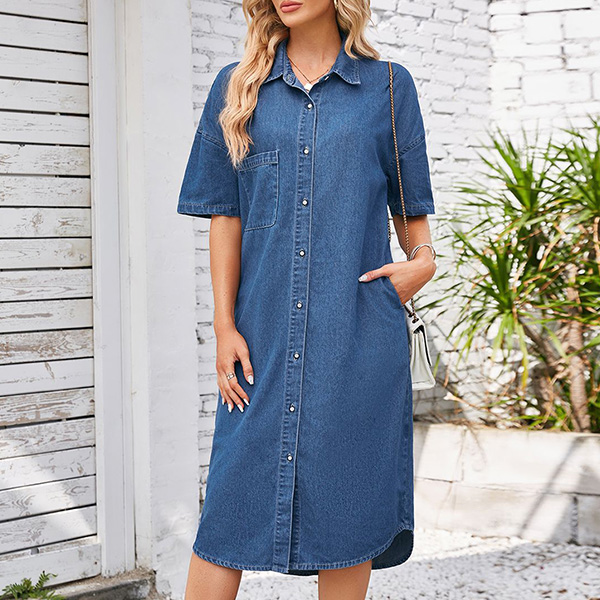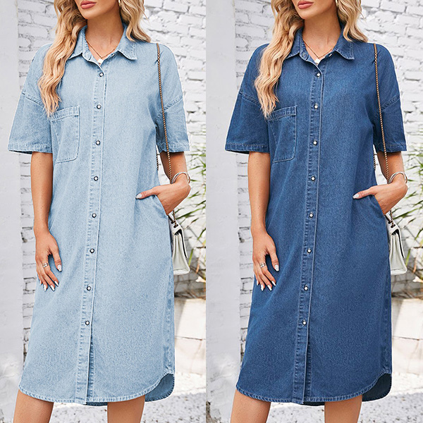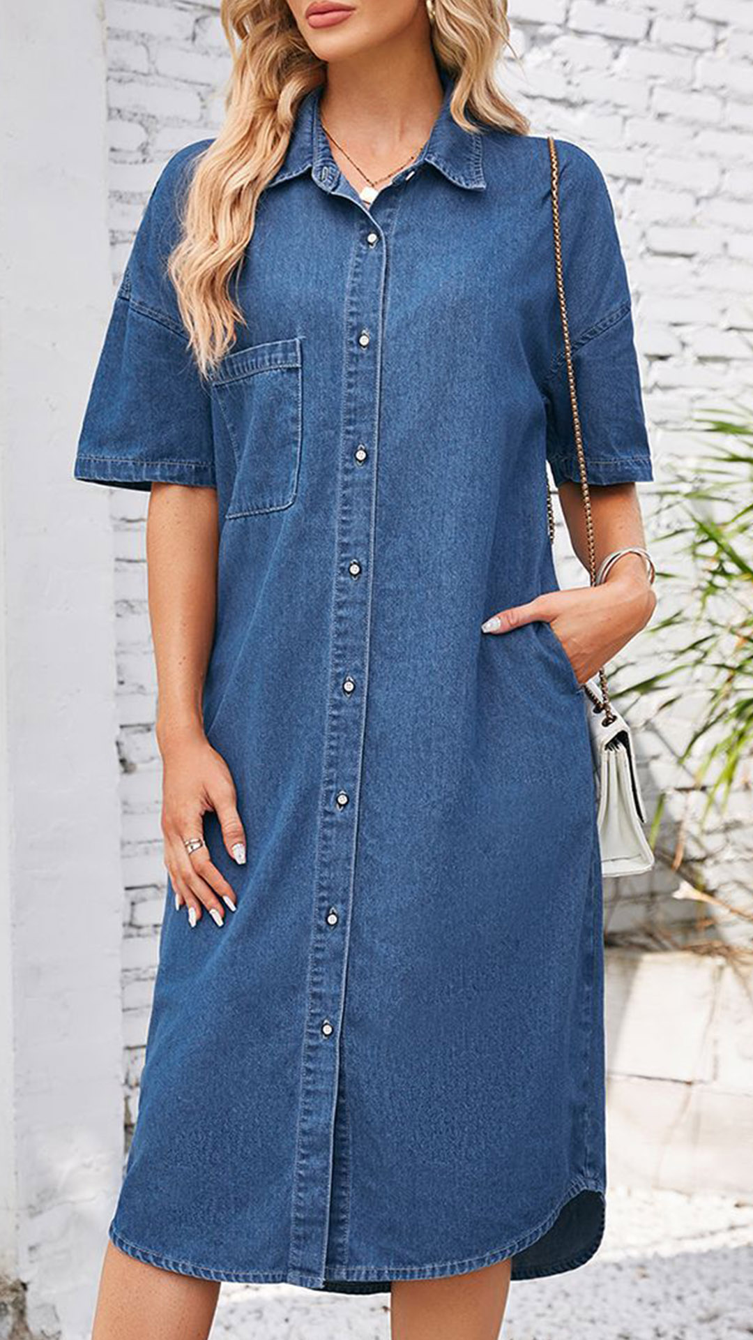 This denim dress combines a loose fit with a denim fabric for a fashionable and casual look.