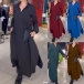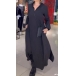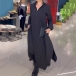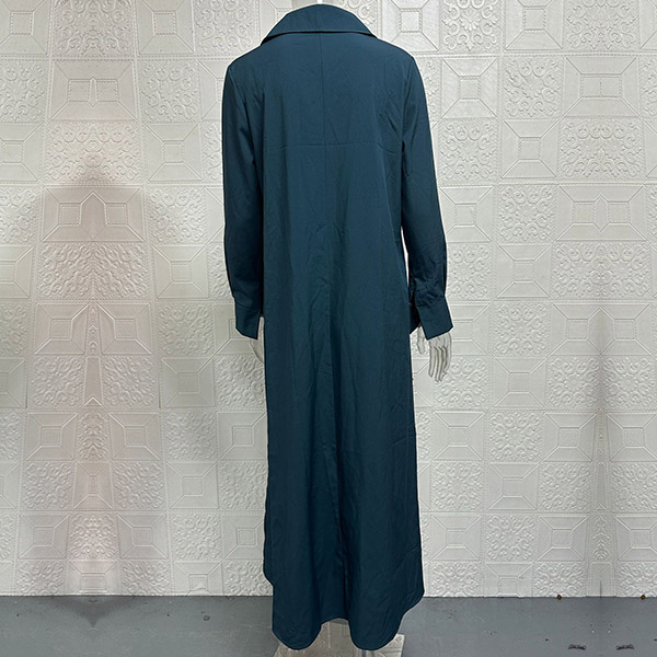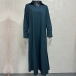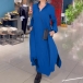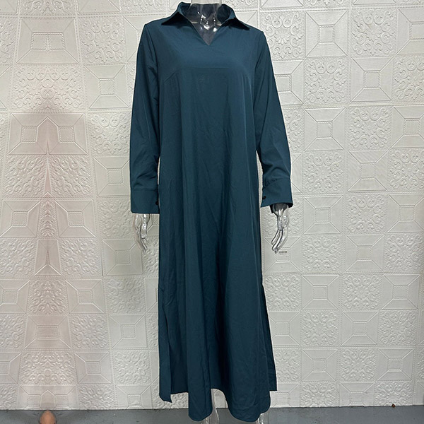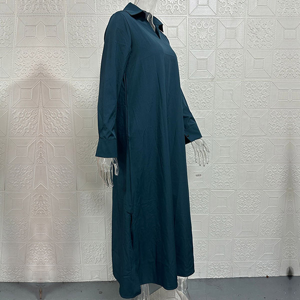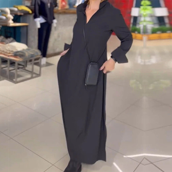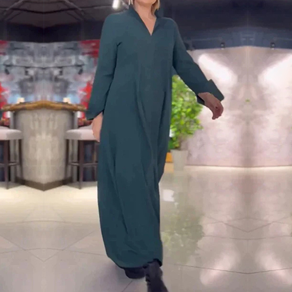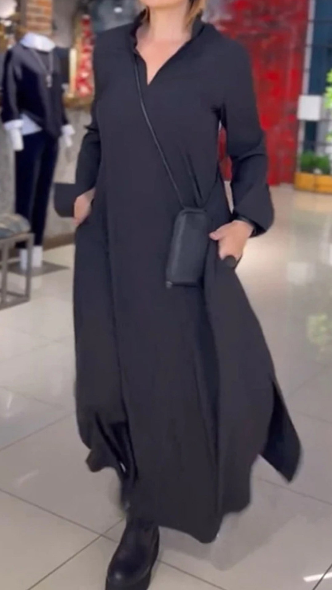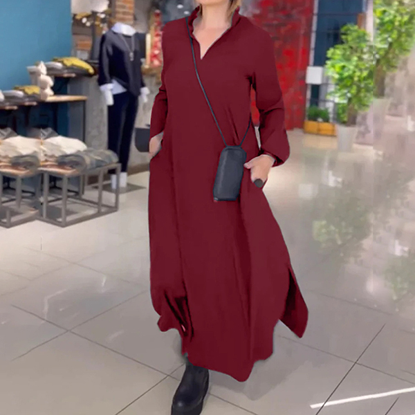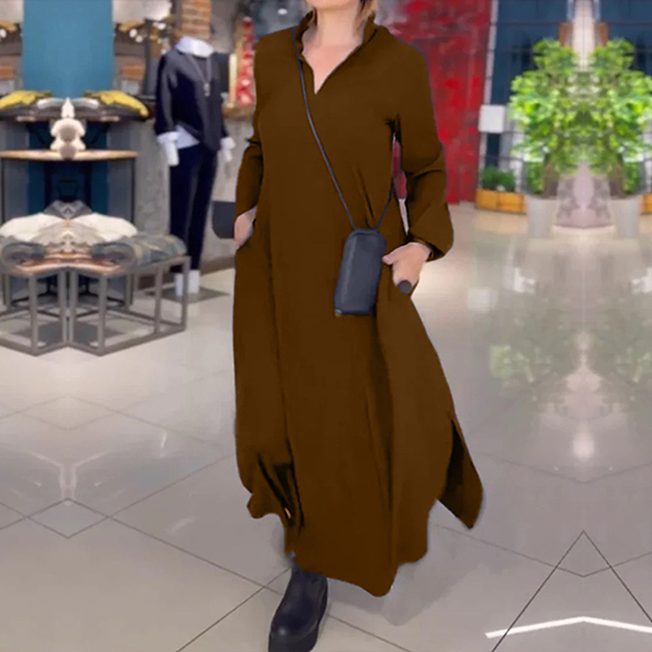 This casual loose dress features a stand collar, long sleeves, and side patch pockets, creating a comfortable and stylish ensemble.