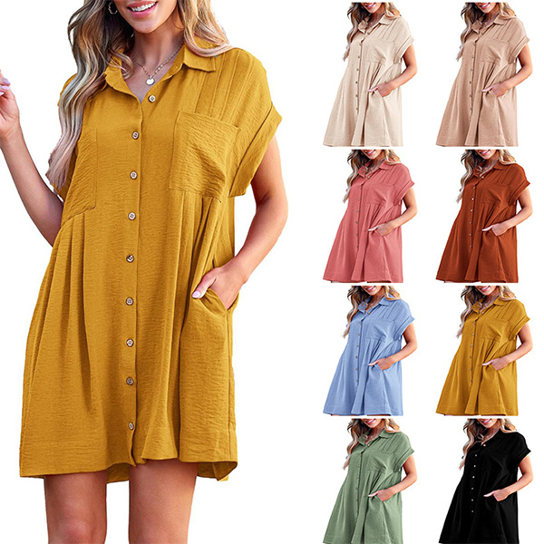 Casual Stand Collar Short Sleeve Buttoned Shirt Dress