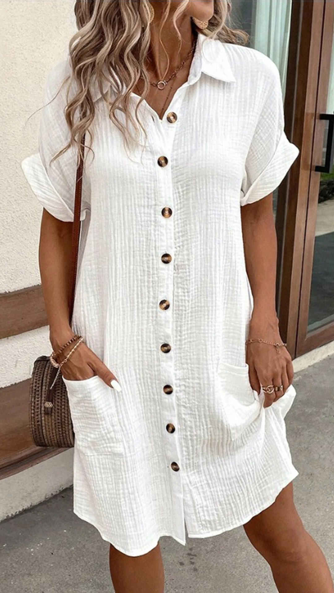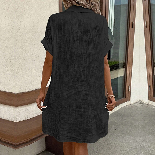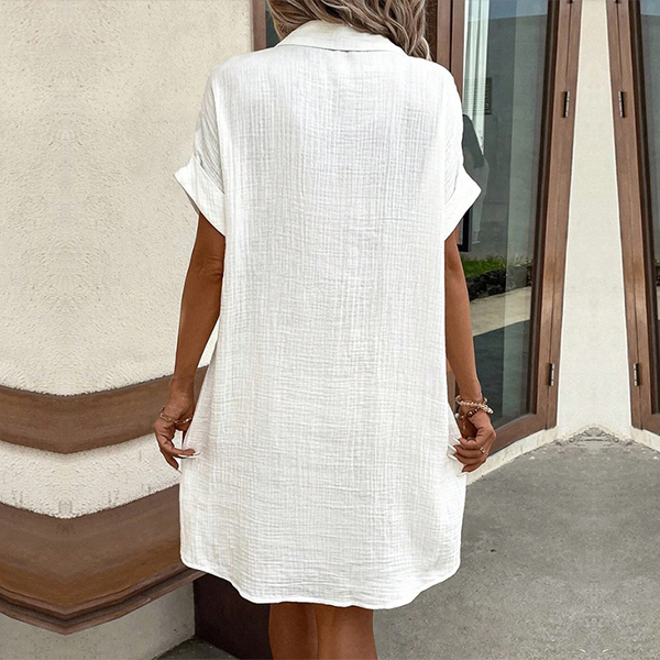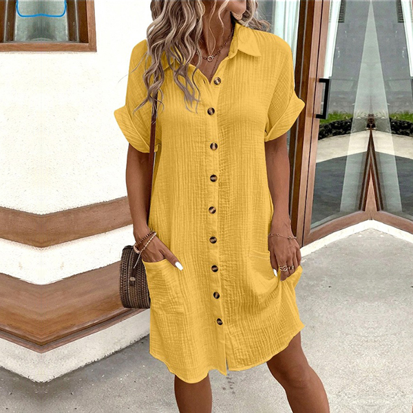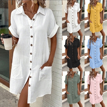 Casual Stand Collar Short Sleeve Patch Pockets Button Shirt Dress
